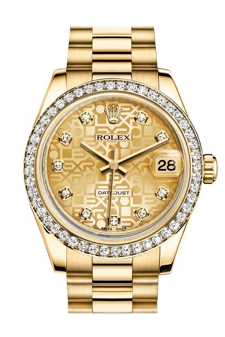 18k gold Fluted bezel. Champagne Jubilee dial with silver hands and Diamond numeral hour markers. Minute markers around the outer rim. Dial Type: analog. Date display at the 3 o'clock position. Automatic movement. Deployment clasp. Luxury watch style. Rolex Datejust Champagne Jubilee Dial Automatic 18K Gold Diamond Bezel Watch 178288