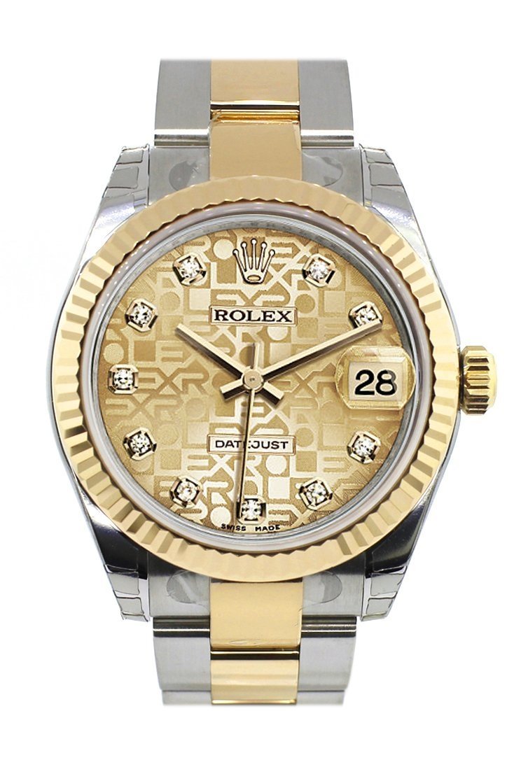 Stainless steel and 18kt gold case with a stainless steel and 18kt gold bracelet. Fluted bezel. Champagne Jubilee Diamond dial with gold-tone hands and diamond hour markers. Dial Type: Analog. Date display at the 3 o'clock position. Automatic movement. Scratch resistant sapphire crystal. Screw down crown. Case diameter: 31 mm. Oysterclasp clasp. Water resistant at 100 meters / 330 feet. Functions: hours, minutes, seconds and date. Luxury watch style. Watch label: Swiss Made. Rolex Datejust Champagne Jubilee Diamond Dial Automatic Stainless Steel and 18kt Gold Ladies Watch 178273