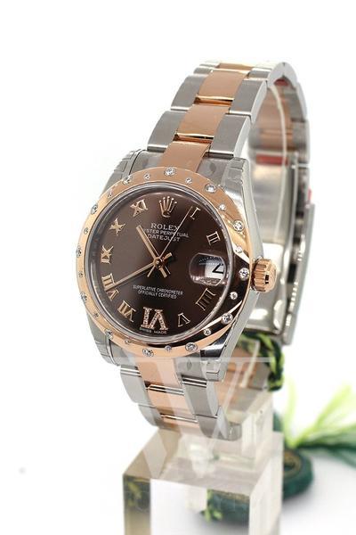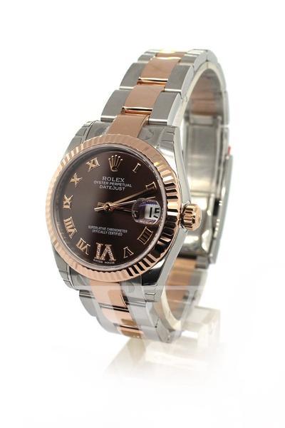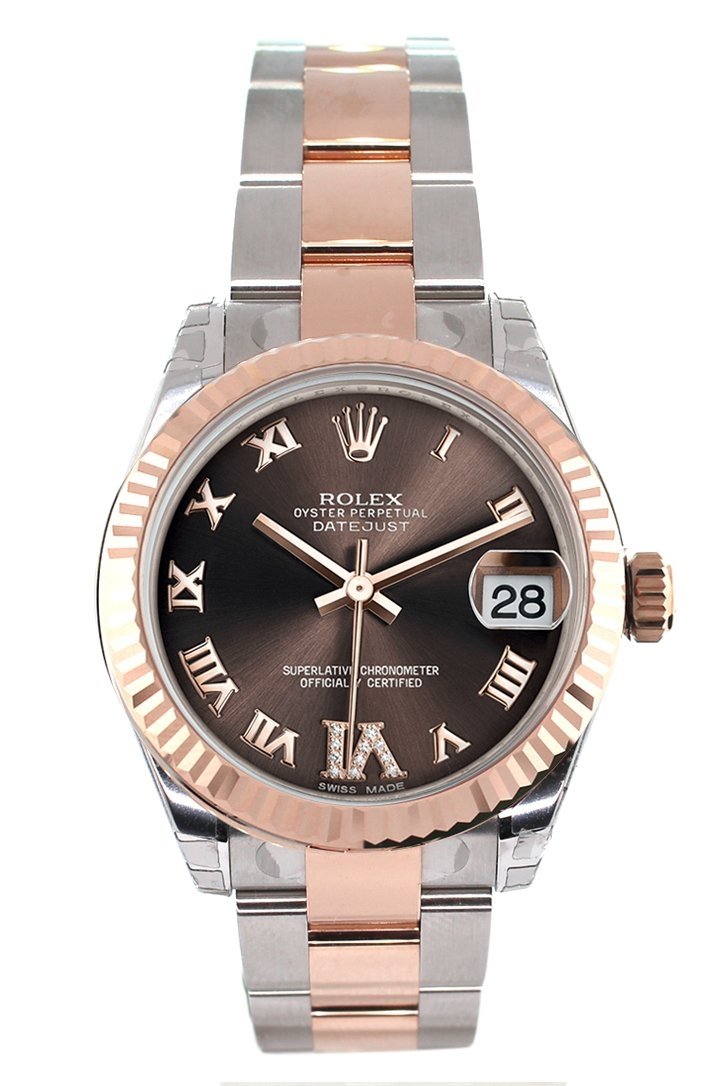 Stainless steel case with a stainless steel and 18kt rose gold bracelet. Fluted 18kt rose gold bezel. Chocolate dial with rose-gold tone hands and VI Diamond numeral hour markers. Minute markers around the outer rim. Dial Type: Analog. Date display at the 3 o'clock position. Automatic movement. Scratch resistant sapphire crystal. Screw down crown. Solid case back. Case diameter: 31mm. Round case shape. Oysterclasp clasp. Water resistant at 100 meters / 330 feet. Functions: date, hour, minute, second. Casual watch style. Watch label: Swiss Made.
