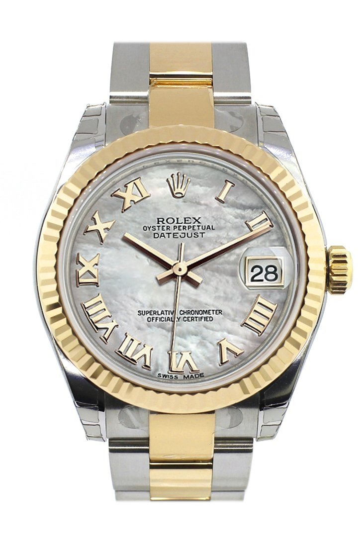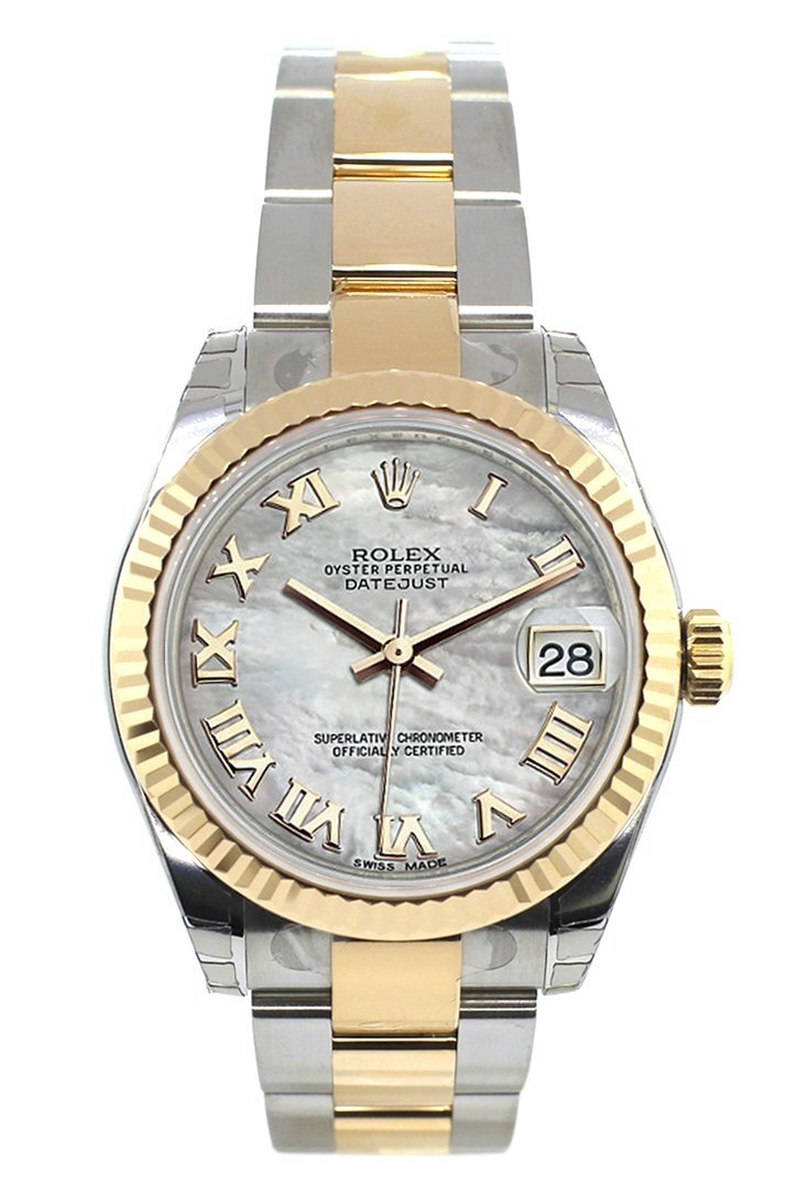Stainless steel and 18kt gold case with a stainless steel and 18kt gold bracelet. Domed bezel. Silver dial with gold-tone hands and Index hour markers. Dial Type: Analog. Date display at the 3 o'clock position. Automatic movement. Scratch resistant sapphire crystal. Screw down crown. Solid case back. Case diameter: 31 mm. Concealed crown clasp. Water resistant at 100 meters / 330 feet. Functions: hours, minutes, seconds and date. Luxury watch style. Watch label: Swiss Made.