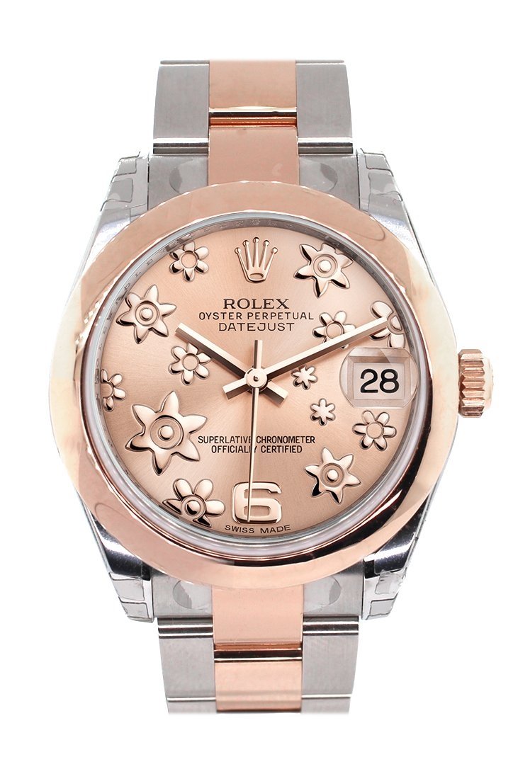 Everose gold case with a oyster everose gold bracelet. Domed bezel. Pink raised floral motif dial with rose gold-tone hands and Arabic at 6 o'clock hour markers. Dial Type: Analog. Date display at the 3 o'clock position. Automatic movement. 2235 engine. Scratch resistant sapphire crystal. Screw down crown. Solid case back. Case diameter: 31 mm. Round case shape. Folding oysterclasp clasp. Water resistant at 100 meters / 330 feet. Functions: date, hour, minute, second. Luxury watch style. Watch label: Swiss Made. Rolex Datejust Pink Raised Floral Motif Dial 18k Rose Gold Automatic Ladies Watch 178241