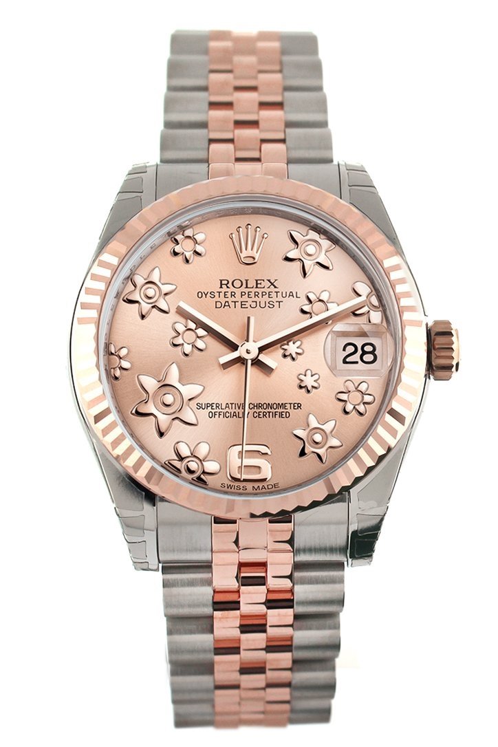 Everose gold case with a Jubilee everose gold bracelet. Fluted bezel. Pink raised floral motif dial with rose gold-tone hands and Arabic at 6 o'clock hour markers. Dial Type: Analog. Date display at the 3 o'clock position. Automatic movement. 2235 engine. Scratch resistant sapphire crystal. Screw down crown. Solid case back. Case diameter: 31 mm. Round case shape. Folding oysterclasp clasp. Water resistant at 100 meters / 330 feet. Functions: date, hour, minute, second. Luxury watch style. Watch label: Swiss Made.