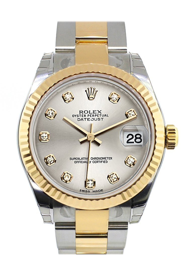 Stainless steel and 18kt gold case with a stainless steel and 18kt gold bracelet. Fluted bezel. Silver Diamond dial with gold-tone hands and diamond hour markers. Dial Type: Analog. Date display at the 3 o'clock position. Automatic movement. Scratch resistant sapphire crystal. Screw down crown. Case diameter: 31 mm. Oysterclasp clasp. Water resistant at 100 meters / 330 feet. Functions: hours, minutes, seconds and date. Luxury watch style. Watch label: Swiss Made. Rolex Datejust Silver Diamond Dial Automatic Stainless Steel and 18kt Gold Ladies Watch 178273