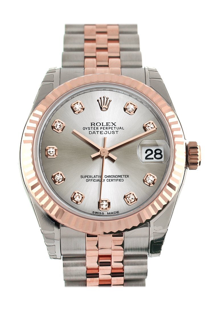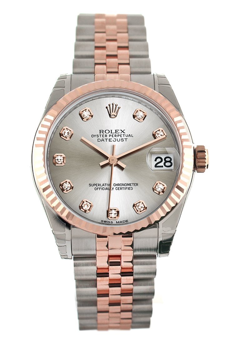 Everose gold case with a Jubilee everose gold bracelet. Fluted bezel. Silver dial with rose gold-tone hands and Diamond hour markers. Dial Type: Analog. Date display at the 3 o'clock position. Automatic movement. 2235 engine. Scratch resistant sapphire crystal. Screw down crown. Solid case back. Case diameter: 31 mm. Round case shape. Folding oysterclasp clasp. Water resistant at 100 meters / 330 feet. Functions: date, hour, minute, second. Luxury watch style. Watch label: Swiss Made.