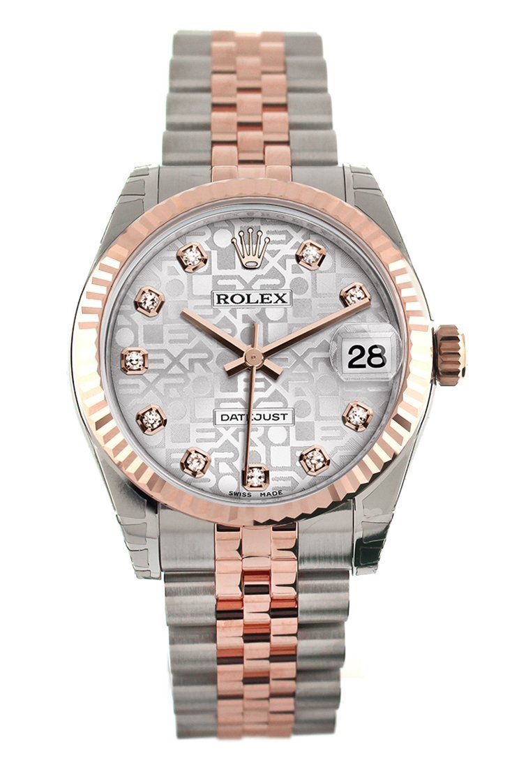 Everose gold case with a Jubilee everose gold bracelet. Fluted bezel. Silver Jubilee dial with rose gold-tone hands and Diamond hour markers. Dial Type: Analog. Date display at the 3 o'clock position. Automatic movement. 2235 engine. Scratch resistant sapphire crystal. Screw down crown. Solid case back. Case diameter: 31 mm. Round case shape. Folding oysterclasp clasp. Water resistant at 100 meters / 330 feet. Functions: date, hour, minute, second. Luxury watch style. Watch label: Swiss Made.