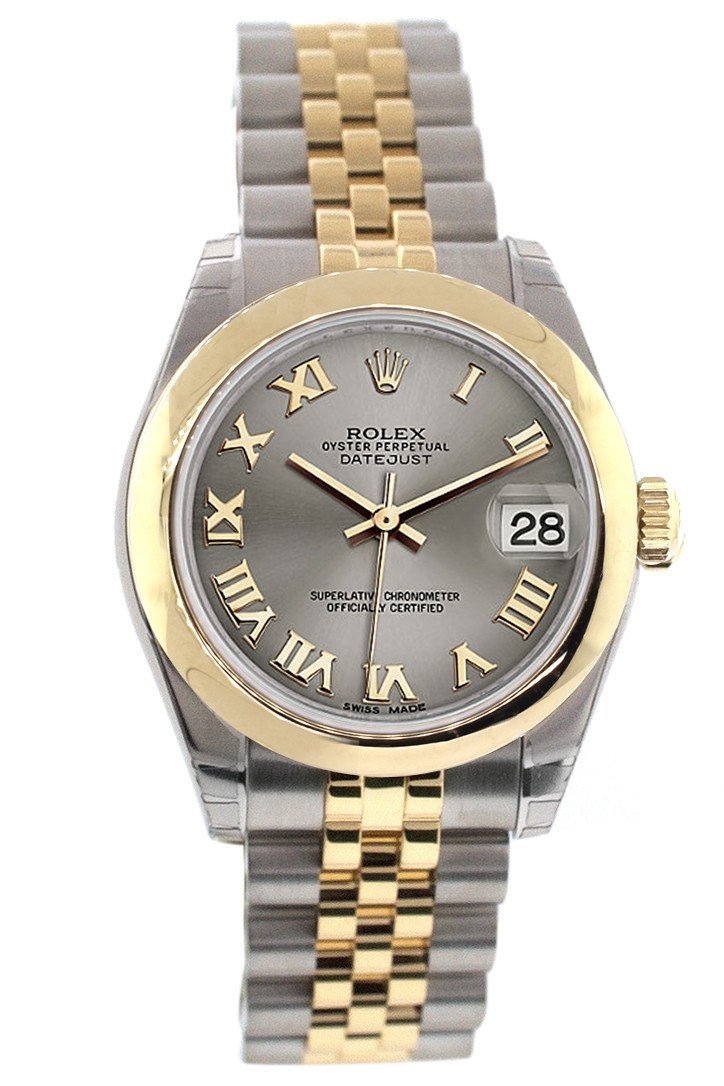 Stainless steel case with a stainless steel Rolex jubilee bracelet with 18kt yellow gold center links. Fixed domed 18kt yellow gold bezel. Steel dial with yellow gold-tone hands and Index numeral hour markers. Dial Type: Analog. Date display at the 3 o'clock position. Rolex Calibre 2235 automatic movement. Scratch resistant sapphire crystal. Screw down crown. Solid case back. Case size: 31 mm. Round case shape. Concealed crown clasp. Water resistant at 100 meters / 330 feet. Functions: date, hour, minute, second. Luxury watch style. Watch label: Swiss Made. Rolex Datejust 31 Oliver Green Dial Steel and 18K Yellow Gold Ladies Watch 178243