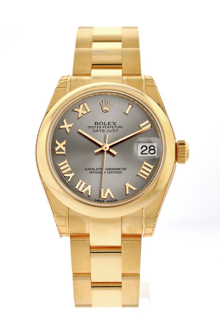18k gold domed bezel. Champagne dial with Steel hands and Roman numeral hour markers. Minute markers around the outer rim. Dial Type: analog. Date display at the 3 o'clock position. Automatic movement. Deployment clasp. Luxury watch style. Rolex Datejust Steel Dial Automatic 18K Gold Bezel Watch 178248