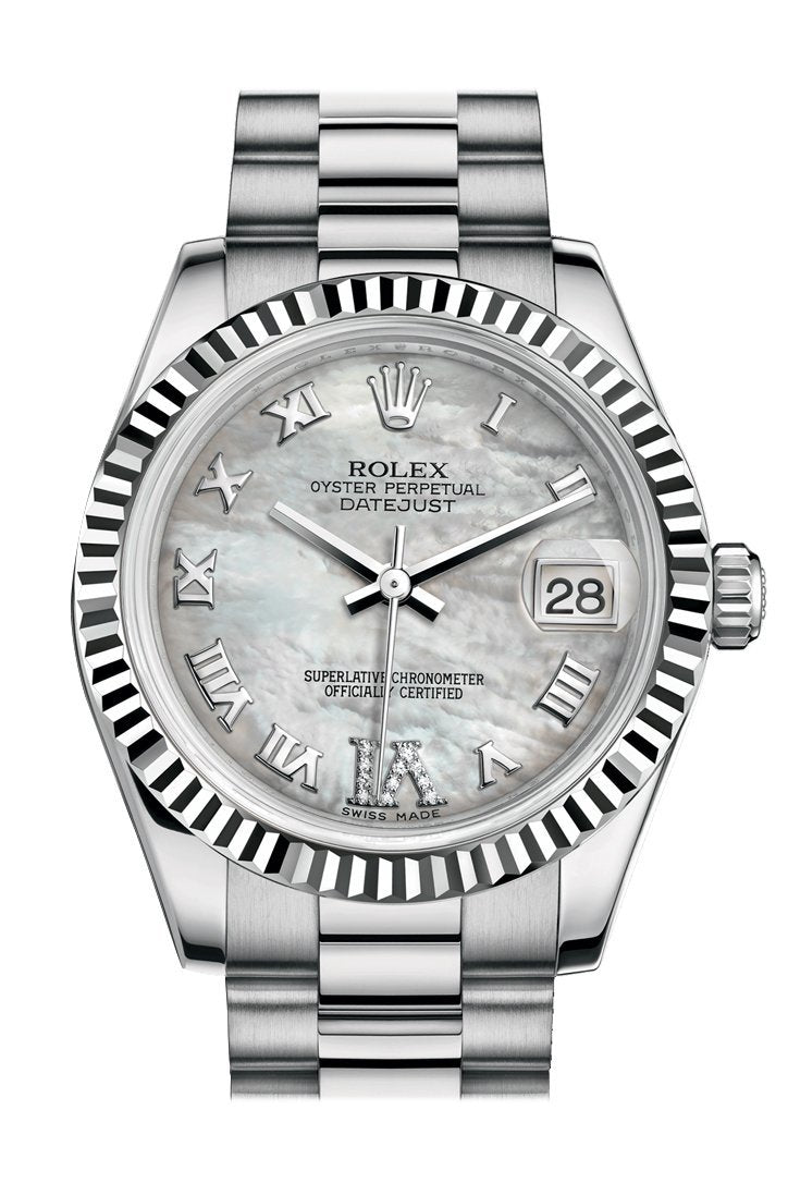 18k White gold case with a 18k White gold Rolex President bracelet. Fixed - fluted 18kWhite gold bezel.mmother-of-pearl dial with rose-gold tone hands and Large VI set with sapphires numeral hour markers. Dial Type: Analog. Date display at the 3 o'clock position. Automatic movement. 2235 engine. Scratch resistant sapphire crystal. Screw down crown. Solid case back. Case diameter: 31 mm. Round case shape. Concealed Crown clasp. Water resistant at 100 meters / 330 feet. Functions: date, hour, minute, second. Luxury watch style. Watch label: Swiss Made. Rolex Lady-Datejust 31 mother-of-pearl Dial 18K Pink Gold President Automatic Ladies Watch 178279
