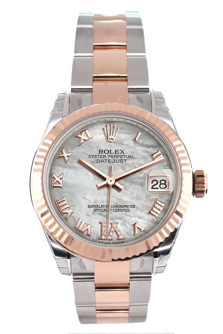Rolex Datejust 31 White Mother of Pearl Roman Large VI set with Diamond Dial Fluted Bezel 18K Rose Gold Two Tone Ladies Watch 178271