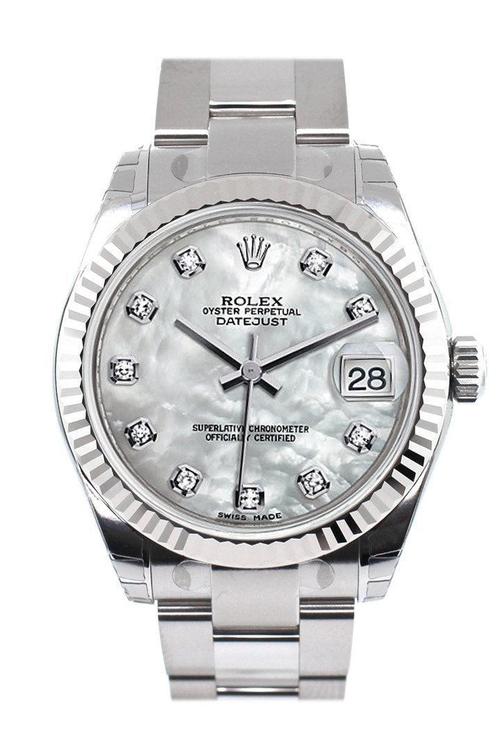 Stainless steel case with a stainless steel rolex oyster bracelet. Fixed - fluted 18k white gold bezel. Mother of pearl dial with silver-tone hands and diamond hour markers. Dial Type: Analog. Date display at the 3 o'clock position. Automatic movement. Scratch resistant sapphire crystal. Screw down crown. Case diameter: 31 mm. Round case shape. Oysterclasp clasp. Water resistant at 100 meters / 330 feet. Functions: date, hour, minute, second. Luxury watch style. Watch label: Swiss Made. Rolex Datejust Lady 31 Mother of Pearl Dial Stainless Steel Rolex Oyster Automatic Watch 178274