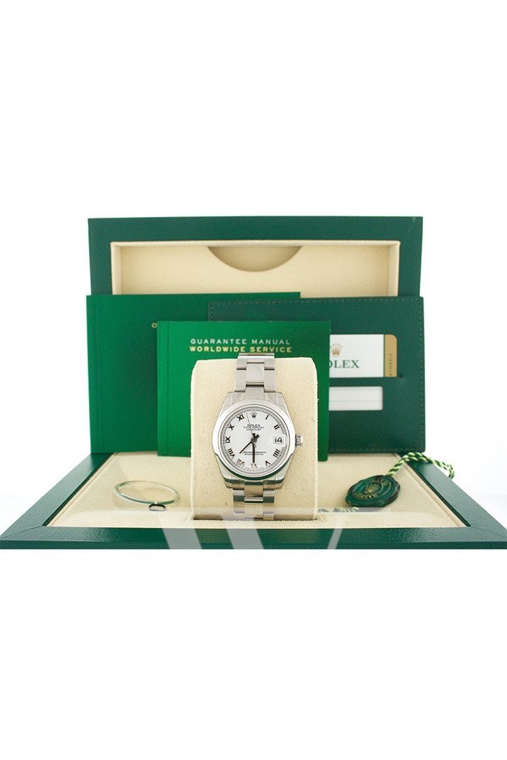 Stainless steel case with a stainless steel oyster bracelet. Fixed, domed bezel bezel. White dial with silver tone hands and Roman numeral hour markers. Date display at the 3 o'clock position. 31 jewels automatic movement. Scratch resistant sapphire crystal. Case diameter: 31 mm. Deployment clasp. Water resistant at 100 meters/ 330 feet. Functions: hours/ minutes/ seconds/ date. Additional Info: date displays at 3 o'clock position. Rolex Datejust White Roman Dial Oyster Bracelet Unisex Watch. 178240
