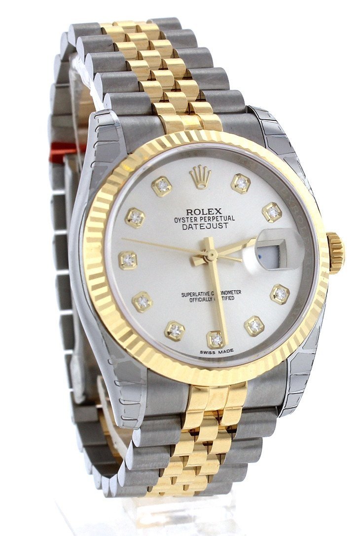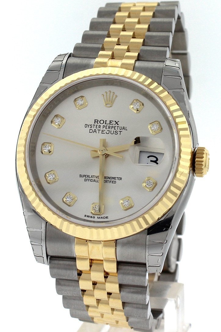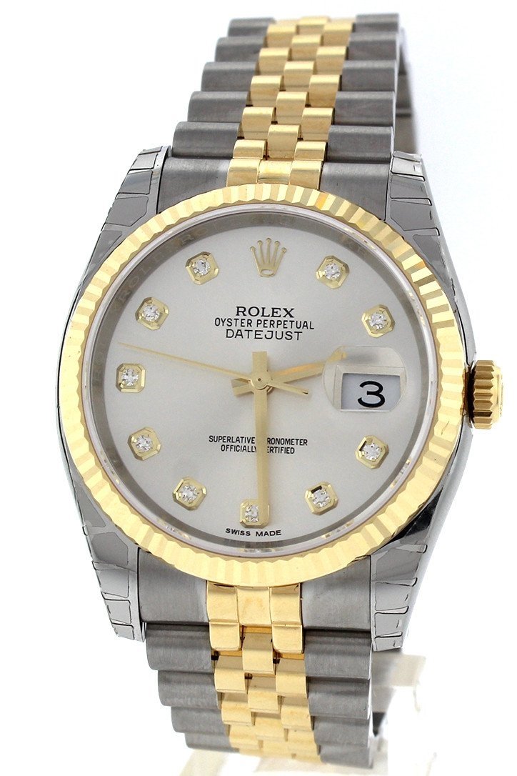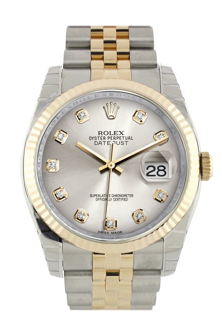 Stainless steel case with a stainless steel Rolex jubilee bracelet with 18kt yellow gold center links. Fixed fluted 18kt yellow gold bezel. Silver Diamond dial with yellow gold-tone hands and Romannumeral hour markers. Dial Type: Analog. Date display at the 3 o'clock position. Rolex calibre 3135 automatic movement with a 50-hour power reserve. Scratch resistant sapphire crystal. Screw down crown. Solid case back. Case size: 36 mm. Round case shape. Hidden deployment clasp. Water resistant at 100 meters / 330 feet. Functions: date, hour, minute, second, chronometer. Additional Info: date displays at 3 o'clock position. Luxury watch style. Watch label: Swiss Made. Item Variations: 116233, 116233-BKJRJ, Rolex-116233, Rolex-116233-BKJRJ. Rolex Oyster Perpetual Datejust 36 Silver Diamond Dial Stainless Steel and 18K Yellow Gold Jubilee Bracelet Automatic Mens Watch 116233