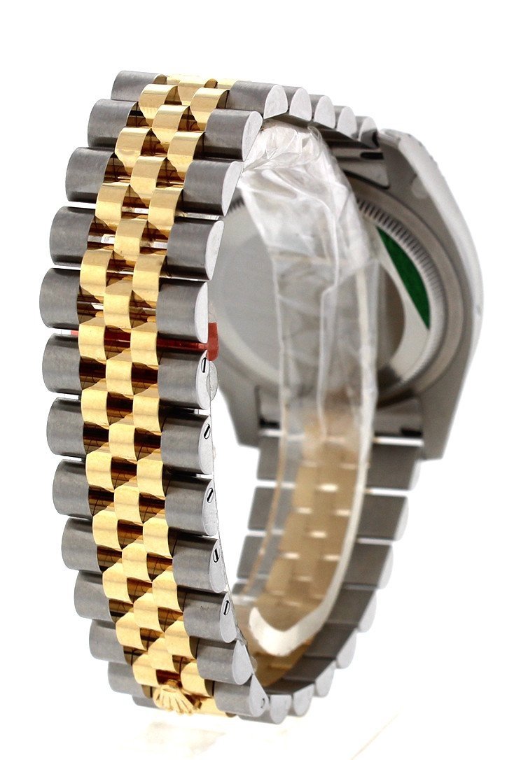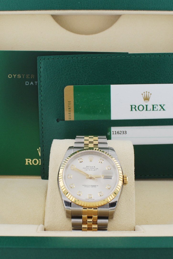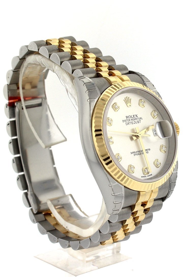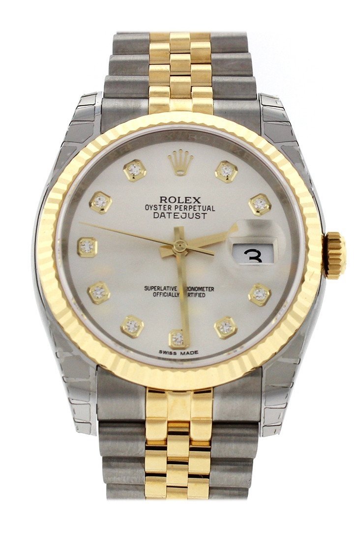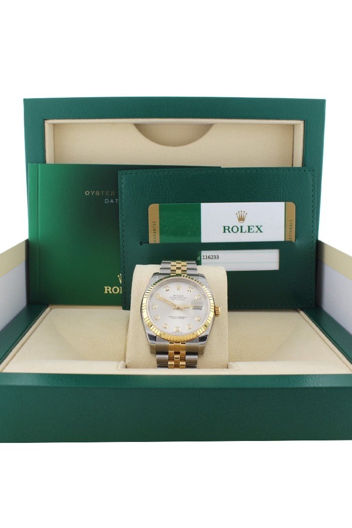 Stainless steel case with a stainless steel Rolex jubilee bracelet with 18kt yellow gold center links. Fixed fluted 18kt yellow gold bezel. Silver Diamond dial with yellow gold-tone hands and Romannumeral hour markers. Dial Type: Analog. Date display at the 3 o'clock position. Rolex calibre 3135 automatic movement with a 50-hour power reserve. Scratch resistant sapphire crystal. Screw down crown. Solid case back. Case size: 36 mm. Round case shape. Hidden deployment clasp. Water resistant at 100 meters / 330 feet. Functions: date, hour, minute, second, chronometer. Additional Info: date displays at 3 o'clock position. Luxury watch style. Watch label: Swiss Made. Item Variations: 116233, 116233-BKJRJ, Rolex-116233, Rolex-116233-BKJRJ. Rolex Oyster Perpetual Datejust 36 Silver Diamond Dial Stainless Steel and 18K Yellow Gold Jubilee Bracelet Automatic Mens Watch 116233