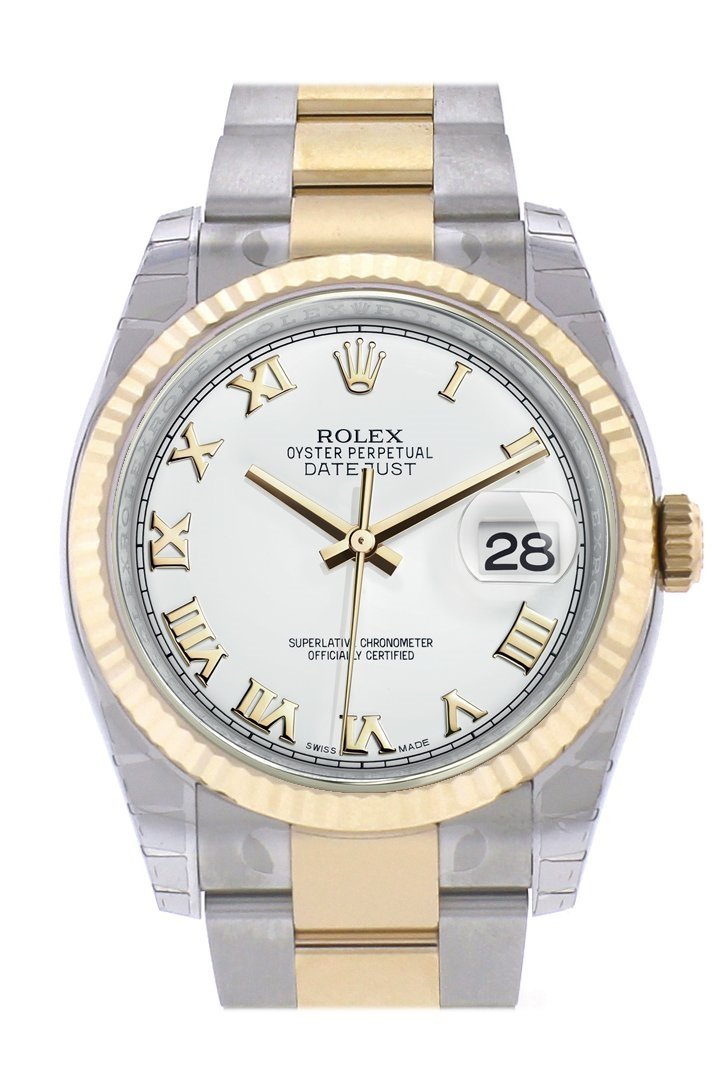 Stainless steel case with a stainless steel Rolex oyster bracelet with 18kt yellow gold center links. Fixed fluted18kt yellow gold bezel. White dial with yellow gold hands and Roman numeral hour markers. Dial Type: Analog. Date display at the 3 o'clock position. Rolex calibre 3135 automatic movement with a 50-hour power reserve. Scratch resistant sapphire crystal. Screw down crown. Solid case back. Case size: 36 mm. Round case shape. Oysterlock clasp. Water resistant at 100 meters / 330 feet. Functions: date, hour, minute, second. Luxury watch style. Watch label: Swiss Made. Rolex Datejust 36 White Dial Stainless Steel and 18K Yellow Gold Rolex Oyster Automatic Mens Watch 116233