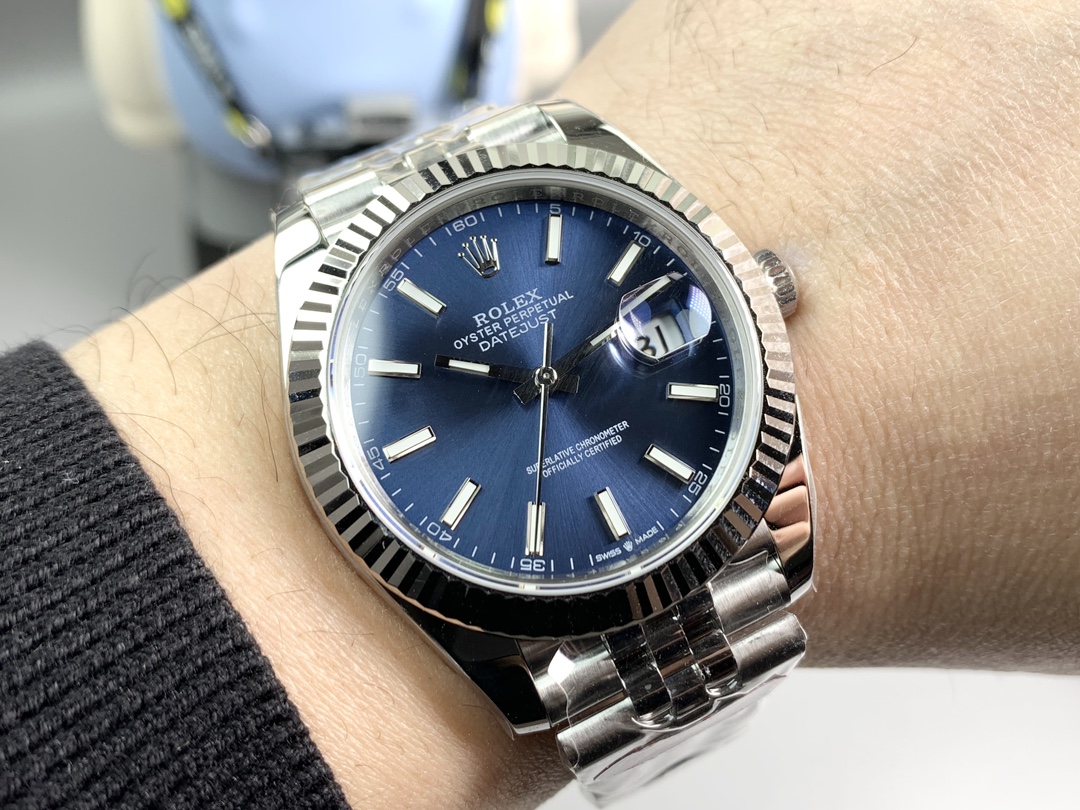 This latest model Datejust 41 features a crisp 18ct white gold fluted bezel and sports the incredibly popular blue baton dial. Fitted to the latest Jubilee bracelet with Oyster clasp, powered by Rolex's next generation automatci movement (cal.3235) and waterproof to 100m.