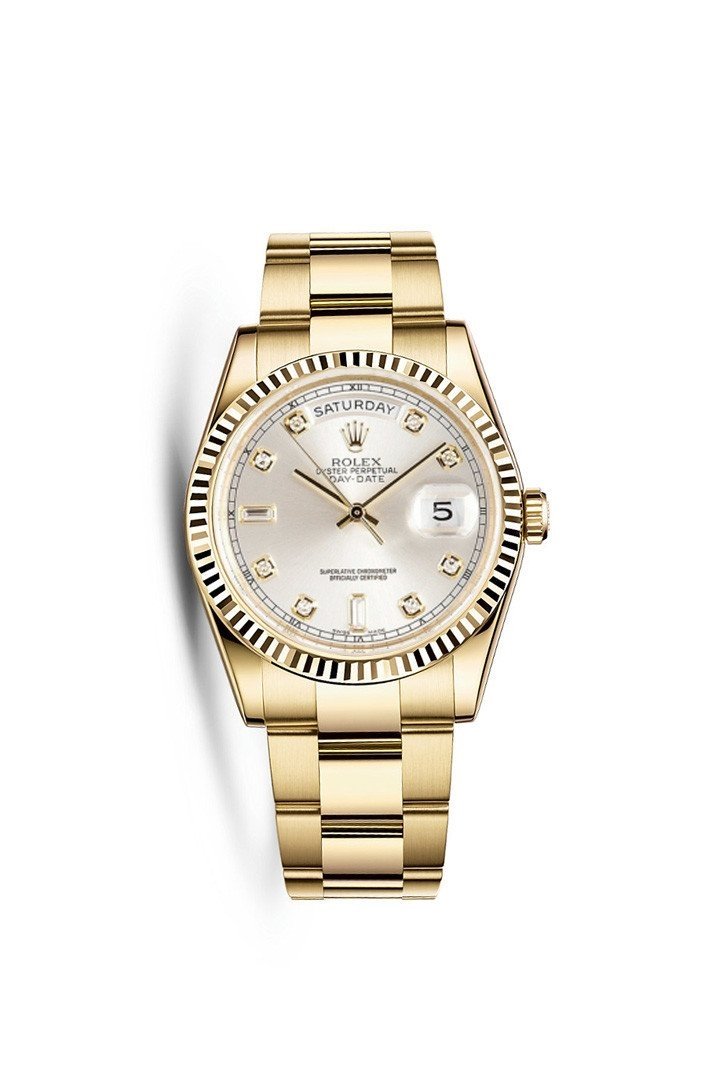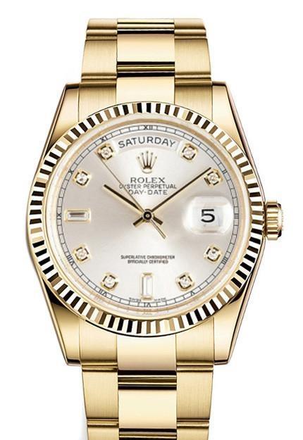 18k yellow gold case with a 18k yellow gold Rolex President bracelet. Fixed - futed 18k yellow gold bezel. Silver dial with yellow gold-tone hands and diamond hour markers. Minute markers around the outer rim. Dial Type: Analog. Date display at 3 o'clock; day display at 12 o'clock. Automatic movement. Scratch resistant sapphire crystal. Screw down crown. Solid case back. Case diameter: 36 mm. Round case shape. Concealed Crown clasp. Water resistant at 100 meters / 330 feet. Functions: date, day, hour, minute, second. Luxury watch style. Watch label: Swiss Made. Rolex Day-Date Silver Dial 18K Yellow Gold President Automatic Mens Diamond Watch. 118238