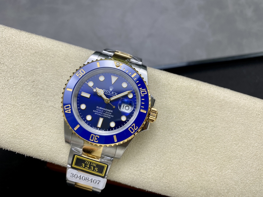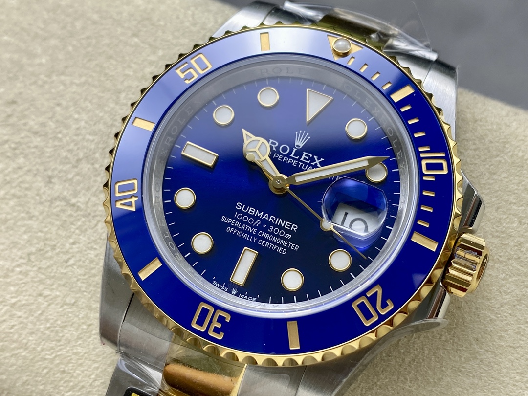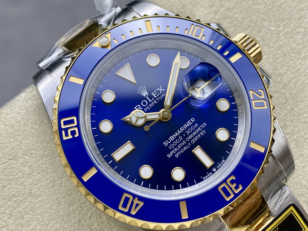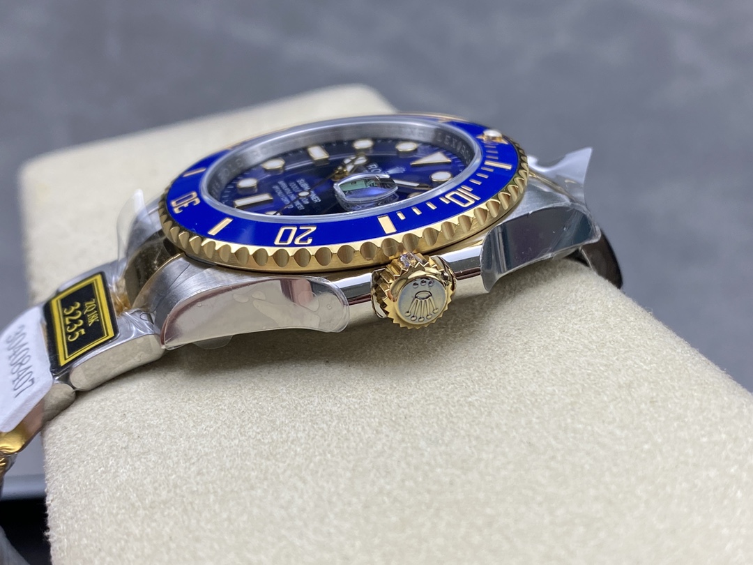 Rolex Submariner Date, 41mm watch of polished Stainless Steel and 18k Yellow Gold. This model has blue dial with a polished 18k Yellow Gold hour, minute and seconds hands in Mercedes-logo and Breguet-style sword shape with luminous fill. Applied polished 18kt Yellow Gold rimmed doty and index hour markers with luminous fill. Fine printed minute/seconds track on the dial rim. Highly legible Chromalight display with long-lasting blue luminescence. Polished 18kt Yellow Gold patented "Triplock" locking crown ensuring that the crown screws down onto the Oyster case as securely as a submarine hatch. The dial closed by a Scratch-resistant Sapphire Crystal and solid case back made. The Watch has Centre hour minute and seconds hands. Stop-seconds for precise time setting. Date window at 3 o'clock with a cyclops magnifier. The watch is equipped unidirectional rotatable polished 18k Yellow Gold bezel with knurled corners for enhanced grip. Blue "Cerachrom" bezel insert, made of ceramic which is extremely hard, durable and highly scratch-resistant. Ceramic has excellent corrosion resistant properties and is unaffected by ultraviolet rays so the color will not fade. It features a 60-minute immersion scale engraved in yellow gold with a luminous point at the origin. The movement is mechanical self-winding 3235, containing 31 Jewels and 70 hours of power reserve. The Rolex Oyster bracelet of brushed outer links Stainless Steel and polished center links 18k Yellow Gold with folding Oysterlock safety clasp with Rolex Glidelock extension system. The water resistance is up to 300 meters/1000 feet.