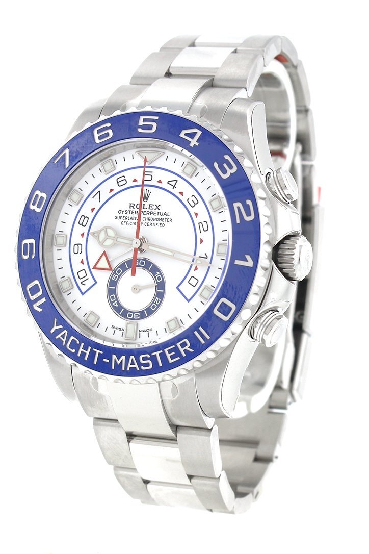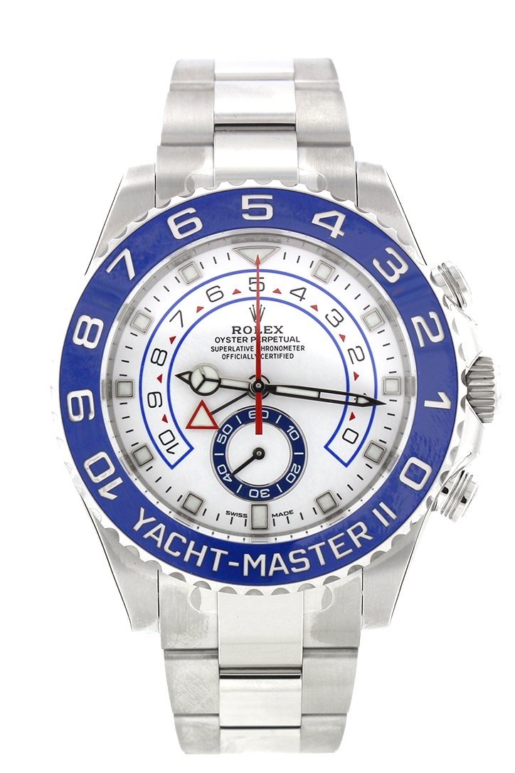 Stainless steel case with a stainless steel Rolex oyster bracelet. Bi-directional rotating stainless steel bezel with a blue cerachrom insert. White dial with silver-tone hands and index hour markers. Minute markers around the outer rim. Dial Type: Analog. Luminescent hands and markers. Small seconds sub-dial above the 6 o'clock position. Automatic movement with a 72 hour power reserve. Scratch resistant sapphire crystal. Screw down crown. Solid case back. Case diameter: 44 mm. Round case shape. Oysterlock clasp. Water resistant at 100 meters / 330 feet. Functions: hour, minute, second. Luxury watch style. Watch label: Swiss Made. Rolex Yacht-Master II White Dial Stainless Steel Rolex Oyster Automatic Mens Watch. 116680