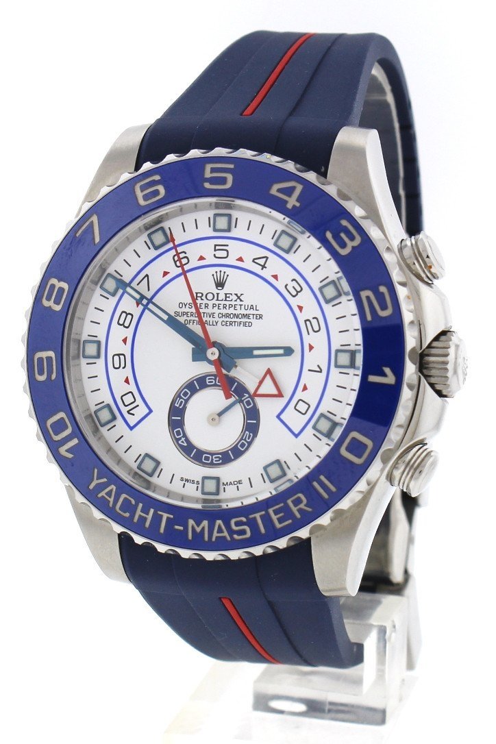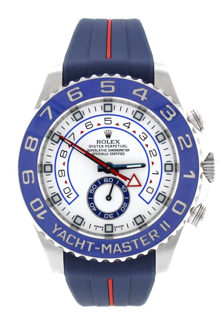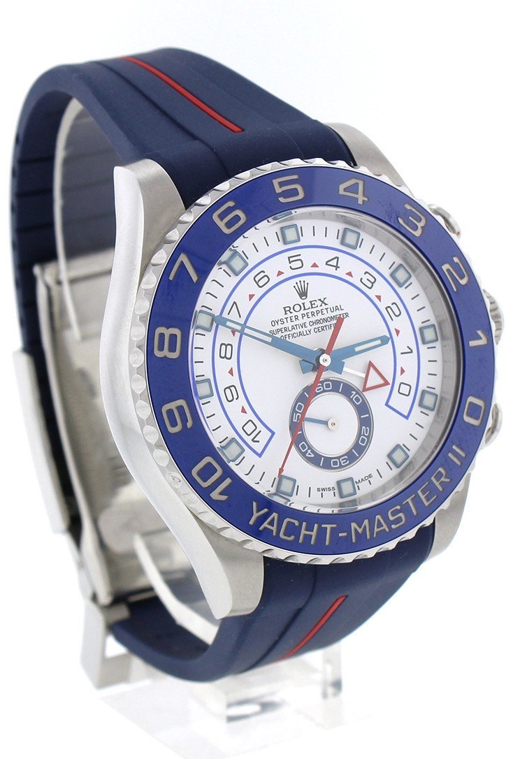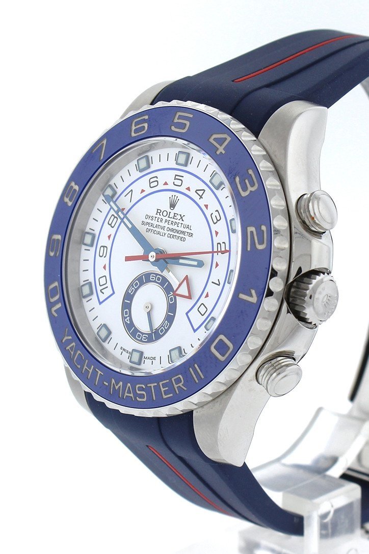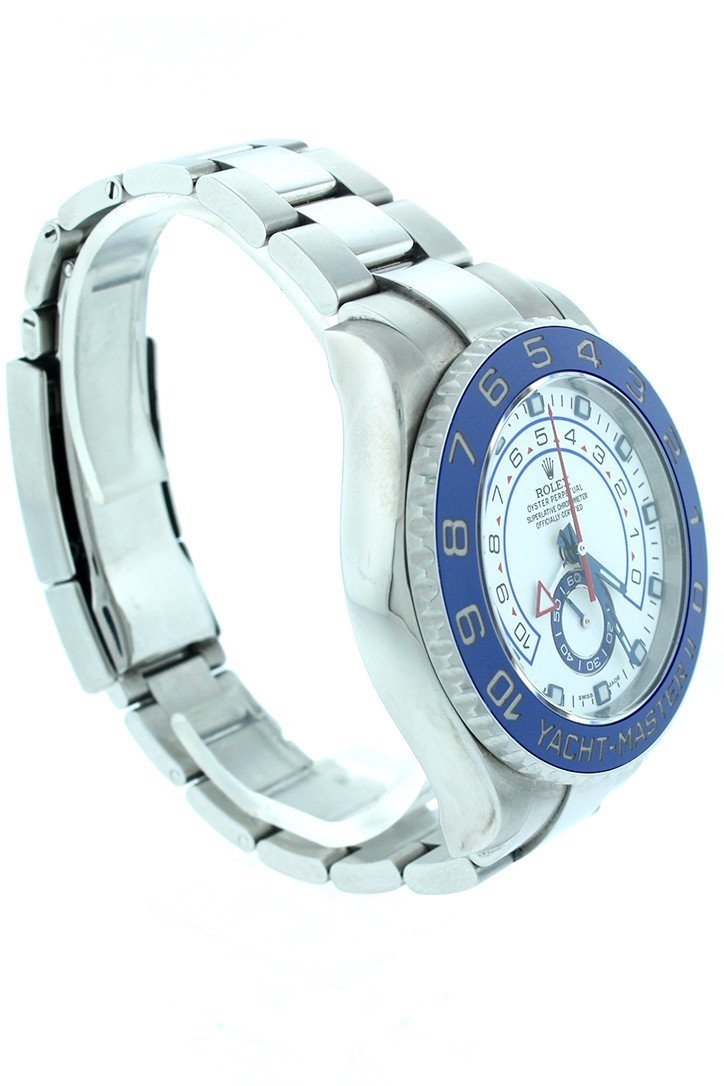 Stainless steel case with a stainless steel Rolex oyster bracelet. Bi-directional rotating stainless steel bezel with a blue cerachrom insert. White dial with silver-tone hands and index hour markers. Minute markers around the outer rim. Dial Type: Analog. Luminescent hands and markers. Small seconds sub-dial above the 6 o'clock position. Automatic movement with a 72-hour power reserve. Scratch resistant sapphire crystal. Screw down crown. Solid case back. Case diameter: 44 mm. Round case shape. Oysterlock clasp. Water resistant at 100 meters / 330 feet. Functions: hour, minute, second. Luxury watch style. Watch label: Swiss Made. Rolex Yacht-Master II White Dial Stainless Steel Rolex Oyster Automatic Mens Watch 116680