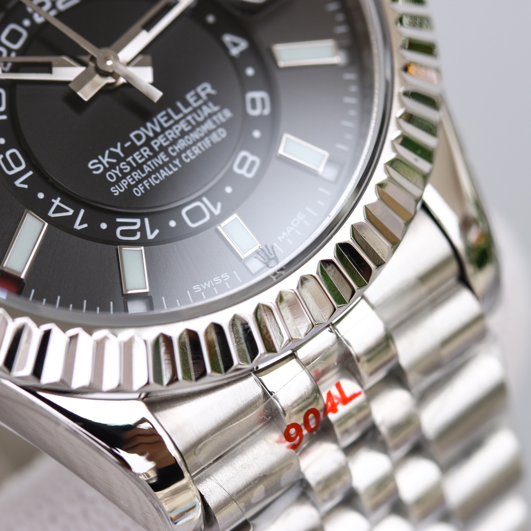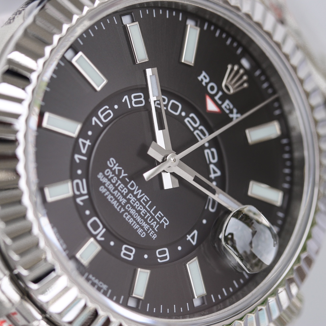 Silver-tone 18kt white gold and stainless steel case with a silver-tone 18kt white gold and stainless steel rolex jubilee bracelet. Fluted bezel. Black dial with silver-tone hands and index hour markers. Dial Type: Analog. Luminescent hands and markers. Date display at the 3 o'clock position. One- 24 hours subdials. Rolex Calibre 9001 automatic movement. Scratch resistant sapphire crystal. Screw down crown. Solid case back. Case size: 42 mm. Round case shape. Water resistant at 100 meters / 330 feet. Functions: date, hour, minute, second. Luxury watch style. Watch label: Swiss Made. Rolex Sky-Dweller White Dial Automatic Mens Oyster Watch 326934. New Release Model 2021