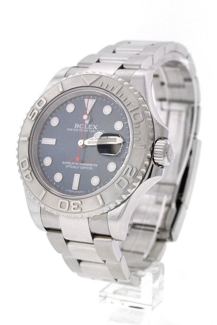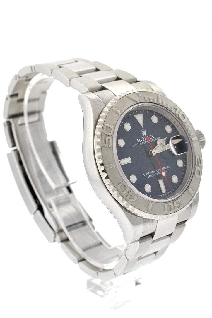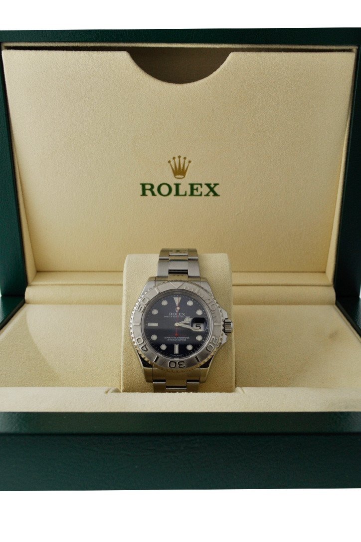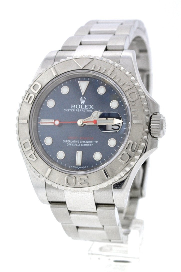 Rolesium (combination steel and platinum) case with a stainless steel Rolex oyster bracelet. Bi-directional rotating platinum bezel. Blue dial with luminous silver-tone hands and dot hour markers. Minute markers around the outer rim. Dial Type: Analog. Luminescent hands and markers. Date display at the 3 o'clock position. Automatic movement. Scratch resistant sapphire crystal. Screw down crown. Solid case back. Case size: 40 mm. Case thickness: 13 mm. Round case shape. Band width: 18 mm. Band length: 8 inches. Oysterlock clasp. Water resistant at 100 meters / 330 feet. Functions: date, hour, minute, second. Luxury watch style. Watch label: Swiss Made. Rolex Yacht-Master 40 Automatic Blue Dial Stainless Steel Rolex Oyster Mens Watch 116622