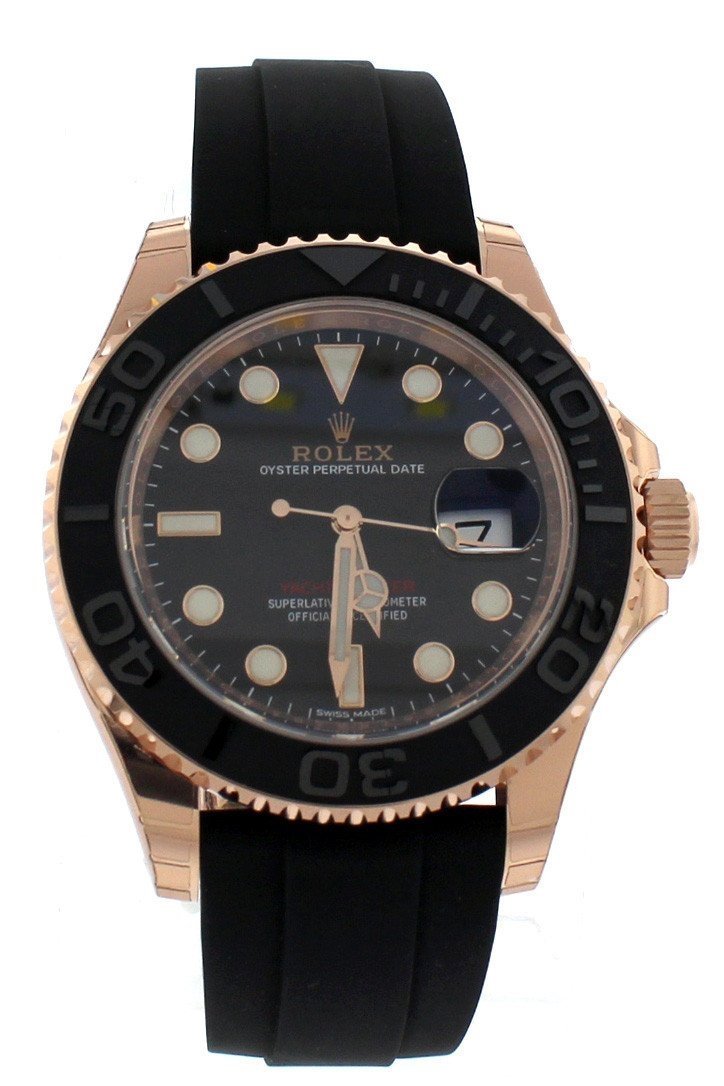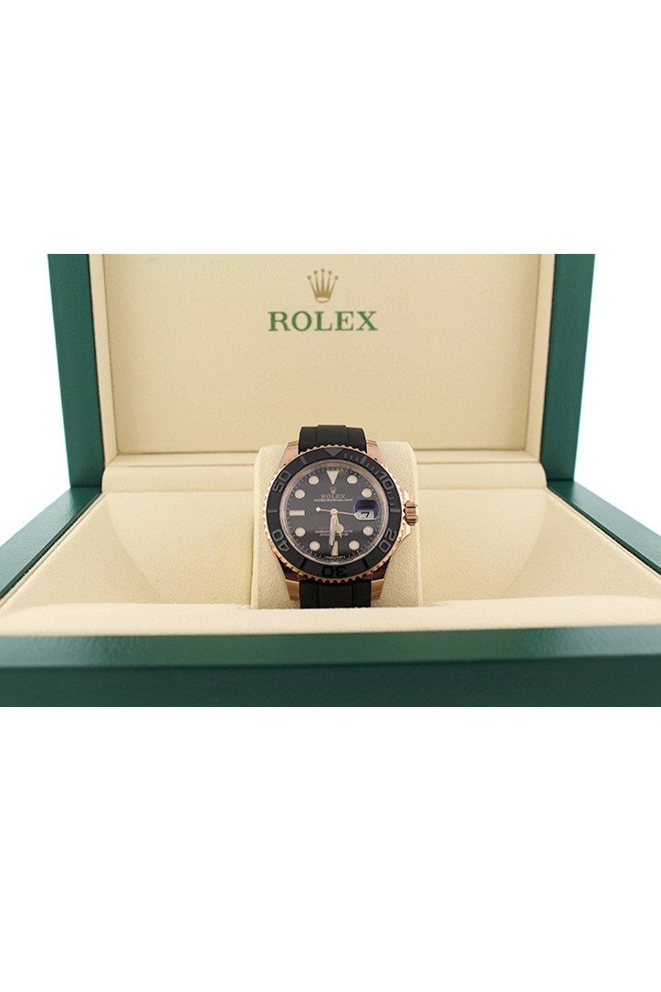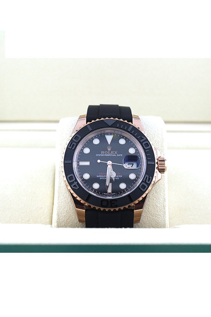 18kt everose gold case with a black rubber strap. Bi-directional rotating everose gold bezel with a black cerachrom top ring. Black dial with luminous everose gold hands and dot hour markers. Minute markers around the outer rim. Dial Type: Analog. Luminescent hands and markers. Date display at the 3 o'clock position. Automatic movement with a 50 hour power reserve. Scratch resistant sapphire crystal. Screw down crown. Solid case back. Case diameter: 40 mm. Round case shape. Folding oysterlock clasp. Water resistant at 100 meters / 330 feet. Functions: date, hour, minute, second. Luxury watch style. Watch label: Swiss Made. Rolex Yacht-Master Automatic Black Dial 18kt Everose Gold Black Rubber Strap Mens Watch. 116655