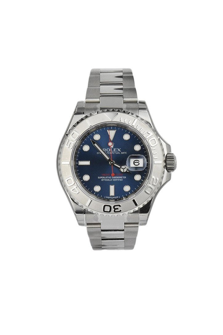 Stainless steel case with a stainless steel bracelet. Bidirectional platinum bezel. Blue dial with luminous hands and dot hour markers. Minute markers around the outer rim. Dial Type: Analog. Luminescent hands and markers. Date display at the 3 o'clock position. Automatic movement. Scratch resistant sapphire crystal. Screw down crown. Solid case back. Case diameter: 40 mm. Round case shape. Oysterlock clasp. Water resistant at 100 meters / 330 feet. Functions: date, hour, minute, second. Luxury watch style. Watch label: Swiss Made. Rolex Yachtmaster Steel and Platinum Blue Dial Men's Watch 116622