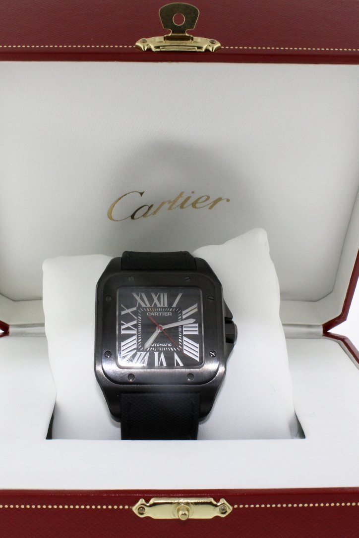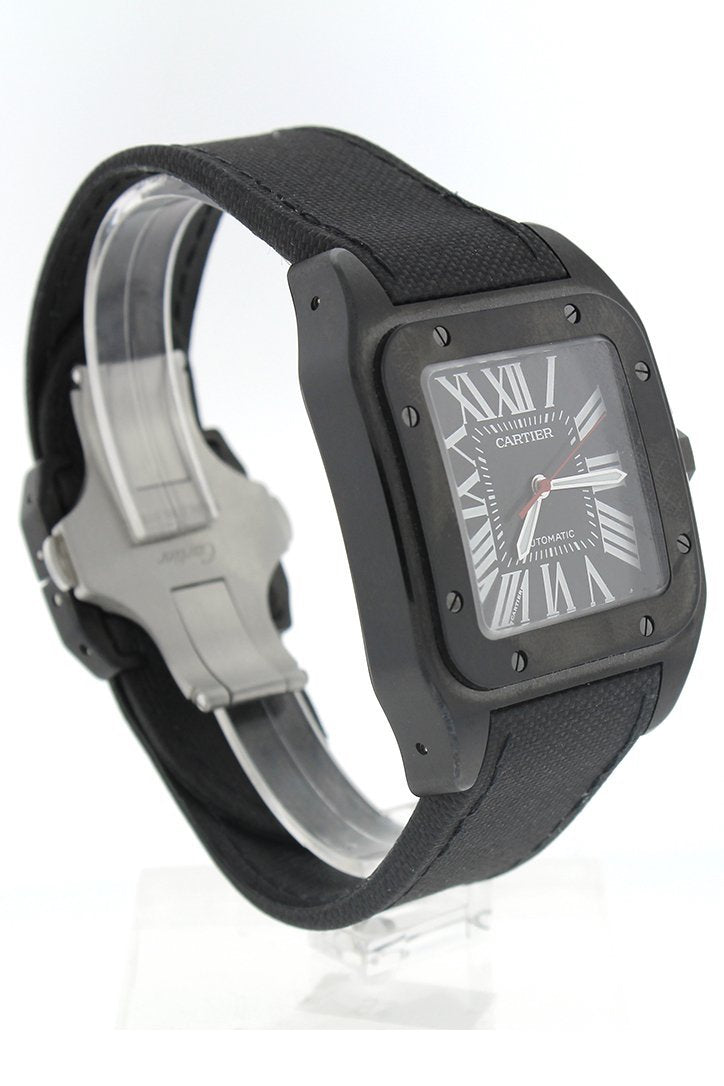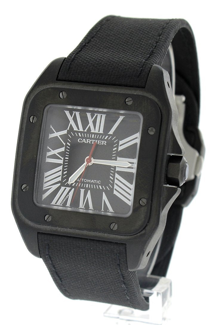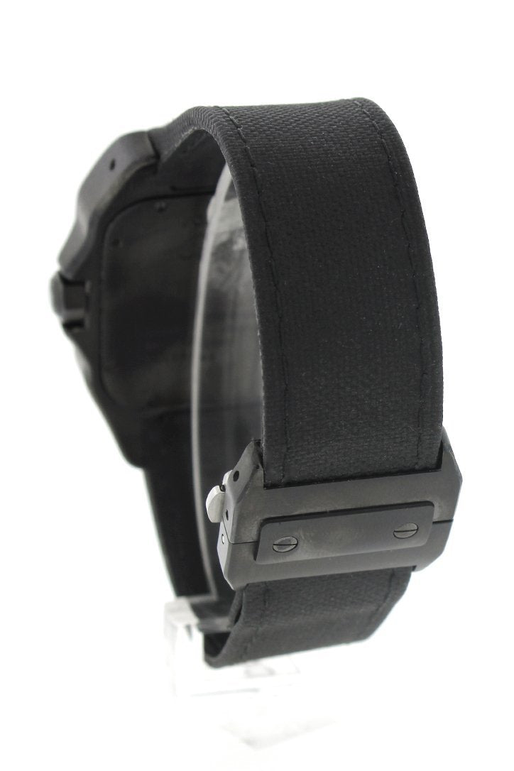 Black dlc stainless steel case with a black fabric bracelet. Fixed black dlc bezel. Black dial with luminous silver-tone hands and Roman numeral hour markers. Minute markers around an inner ring. Dial Type: Analog. Luminescent hands and markers. Cartier caliber 1847 automatic movement. Scratch resistant sapphire crystal. Pull / push crown. Solid case back. Case dimensions: 51 mm x 41 mm. Case thickness: 10.34 mm. Square case shape. Band width: 20 mm. Deployment clasp. Water resistant at 100 meters / 330 feet. Functions: hour, minute, second. Luxury watch style. Watch label: Swiss Made. Cartier Santos Automatic Black Dial Mens Watch WSSA0006