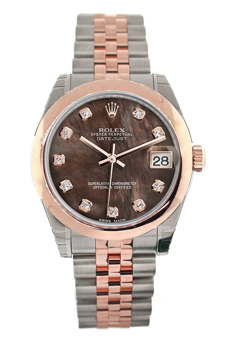 Everose gold case with a Jubilee everose gold bracelet. Domed bezel. Black Mother of Pearl dial with rose gold-tone hands and Diamond hour markers. Dial Type: Analog. Date display at the 3 o'clock position. Automatic movement. 2235 engine. Scratch resistant sapphire crystal. Screw down crown. Solid case back. Case diameter: 31 mm. Round case shape. Folding oysterclasp clasp. Water resistant at 100 meters / 330 feet. Functions: date, hour, minute, second. Luxury watch style. Watch label: Swiss Made. Rolex Datejust Black Mother of Pearl Dial 18k Rose Gold Automatic Ladies Watch 178241