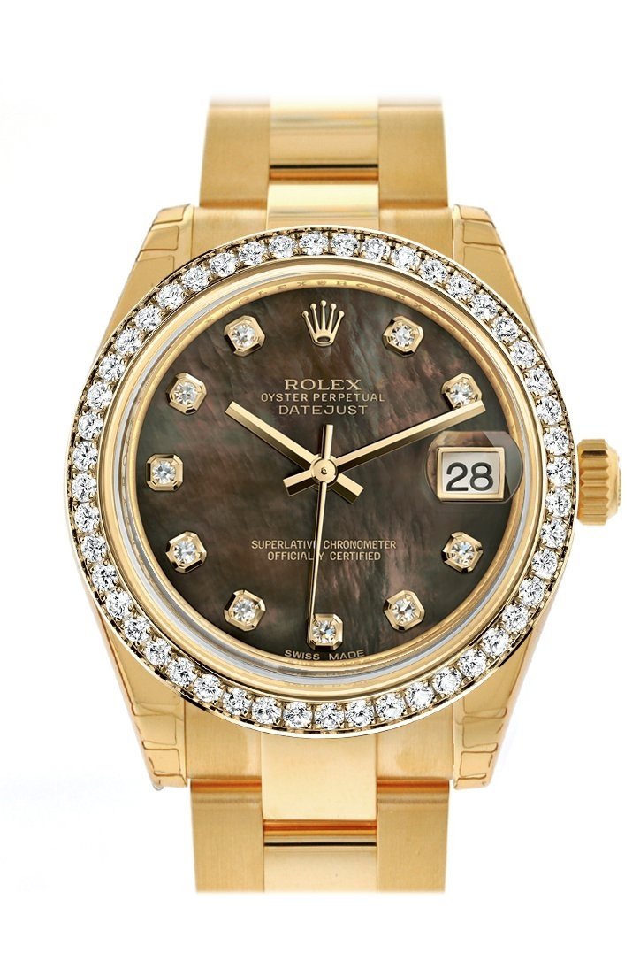 18k gold Fluted bezel. Black Mother of Pearl dial with White hands and Diamond hour markers. Minute markers around the outer rim. Dial Type: analog. Date display at the 3 o'clock position. Automatic movement. Deployment clasp. Luxury watch style. Rolex Datejust Black Mother of Pearl Dial Automatic 18K Gold Diamond Bezel Watch 178288