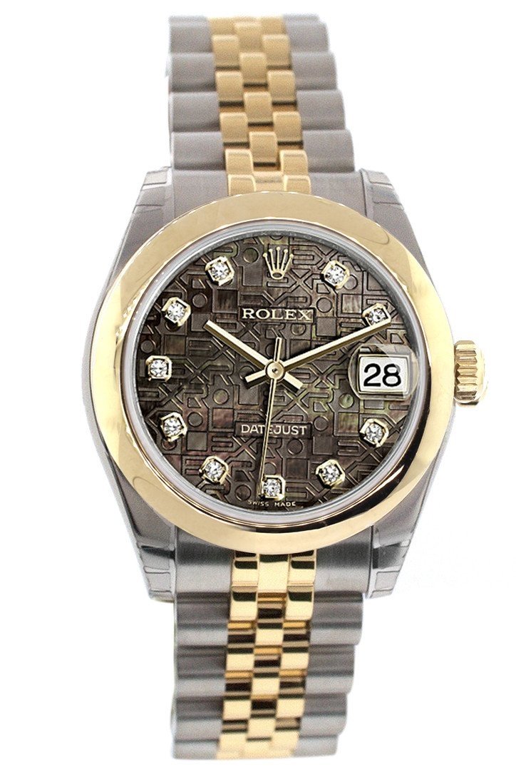 Stainless steel and 18kt gold case with a stainless steel and 18kt gold bracelet. Domed bezel. Black Mother of pearl jubilee dial with gold-tone hands and diamond hour markers. Dial Type: Analog. Date display at the 3 o'clock position. Automatic movement. Scratch resistant sapphire crystal. Screw down crown. Solid case back. Case diameter: 31 mm. Concealed crown clasp. Water resistant at 100 meters / 330 feet. Functions: hours, minutes, seconds and date. Luxury watch style. Watch label: Swiss Made. Rolex Datejust Black Mother of pearl Dial Automatic Stainless Steel and 18kt Gold Ladies Watch 178243