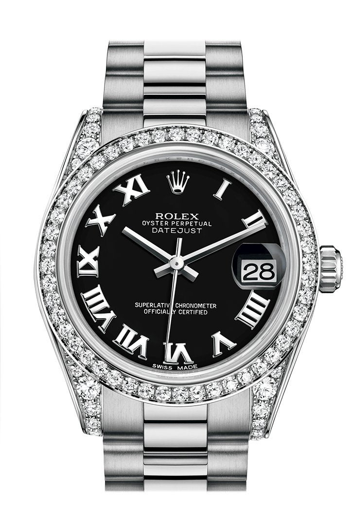 18k White gold case with a 18k White gold Rolex President bracelet. Fixed - fluted 18k White gold Diamond bezel Diamond Lugs. Black dial with rose-gold tone hands and Roman numeral hour markers. Dial Type: Analog. Date display at the 3 o'clock position. Automatic movement. 2235 engine. Scratch resistant sapphire crystal. Screw down crown. Solid case back. Case diameter: 31 mm. Round case shape. Concealed Crown clasp. Water resistant at 100 meters / 330 feet. Functions: date, hour, minute, second. Luxury watch style. Watch label: Swiss Made. Rolex Lady-Datejust Black Dial 18K White Gold President Automatic Ladies Watch 178159