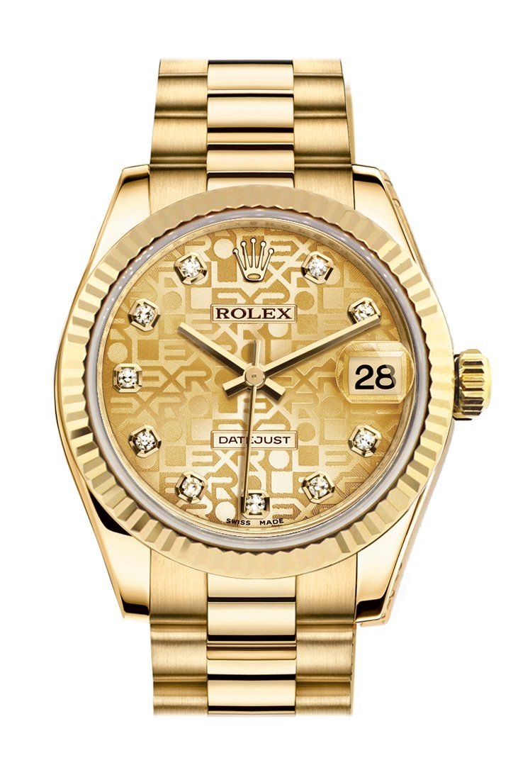 18k gold Fluted bezel. Champagne Jubilee dial with silver hands and Diamond numeral hour markers. Minute markers around the outer rim. Dial Type: analog. Date display at the 3 o'clock position. Automatic movement. Deployment clasp. Luxury watch style. Rolex Datejust Champagne Dial Automatic 18K Gold Bezel Watch 178278