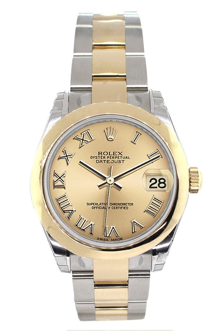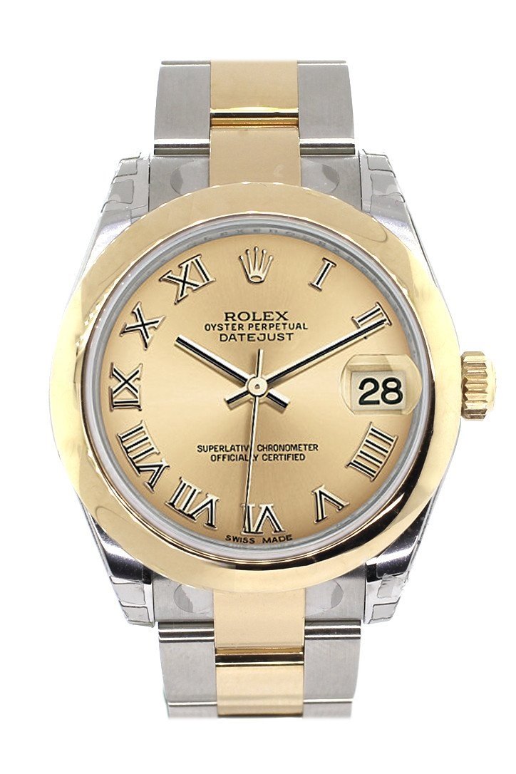 Stainless steel case with a stainless steel with 18kt yellow gold center links bracelet. Fixed domed 18kt yellow gold bezel. Champagne dial with luminous hands and luminous stick hour markers. Minute markers around the outer rim. Dial Type: Analog. Luminescent hands and dial markers. Date display at the 3 o'clock position. Automatic movement. Scratch resistant sapphire crystal. Solid case back. Case diameter: 31 mm. Round case shape. Deployment clasp. Water resistant at 100 meters/ 330 feet. Functions: hours/ minutes/ seconds/ date. Additional Info: date displays at 3 o'clock position. Luxury watch style. Watch label: Swiss Made. Rolex Datejust