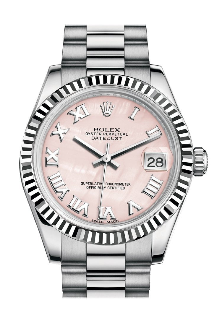 Rolex Datejust 31 Pink mother-of-pearl Roman Dial Fluted Bezel 18K White Gold President Ladies Watch 178279
