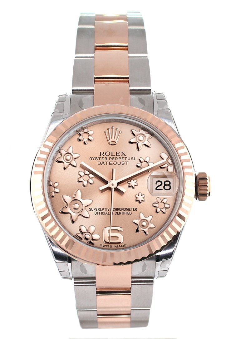 Everose gold case with a oyster everose gold bracelet. Fluted bezel. Pink raised floral motif dial with rose gold-tone hands and Arabic at 6 o'clock hour markers. Dial Type: Analog. Date display at the 3 o'clock position. Automatic movement. 2235 engine. Scratch resistant sapphire crystal. Screw down crown. Solid case back. Case diameter: 31 mm. Round case shape. Folding oysterclasp clasp. Water resistant at 100 meters / 330 feet. Functions: date, hour, minute, second. Luxury watch style. Watch label: Swiss Made.
