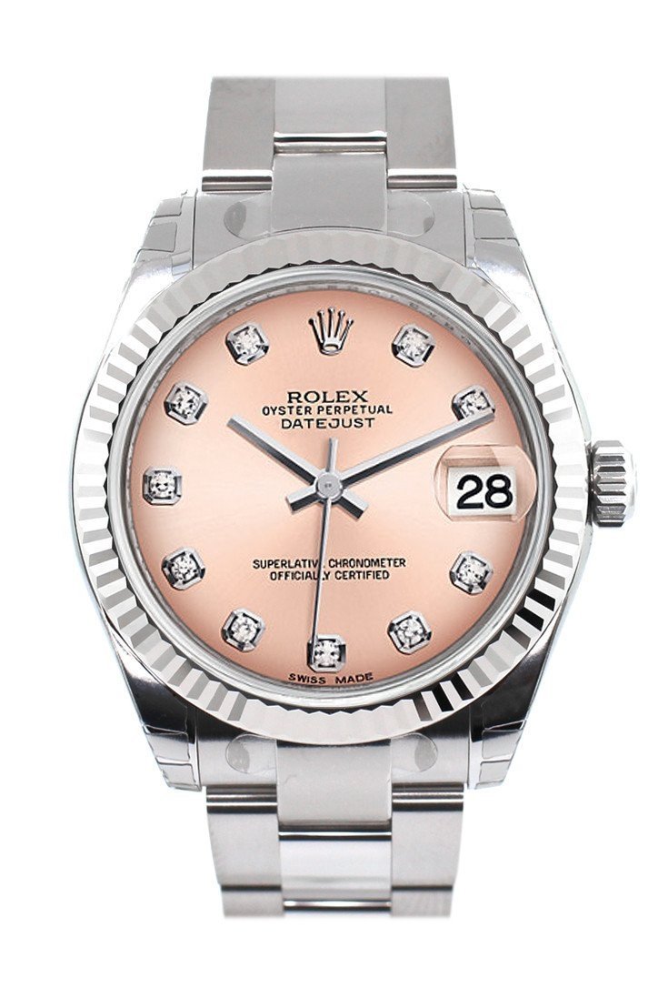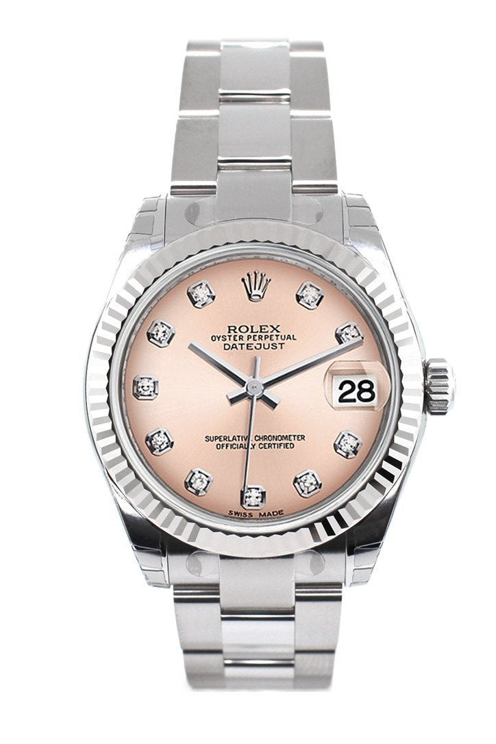 • Rolex Datejust 31 Pink Set Diamonds Dial White Gold Fluted Bezel Ladies Watch 178274