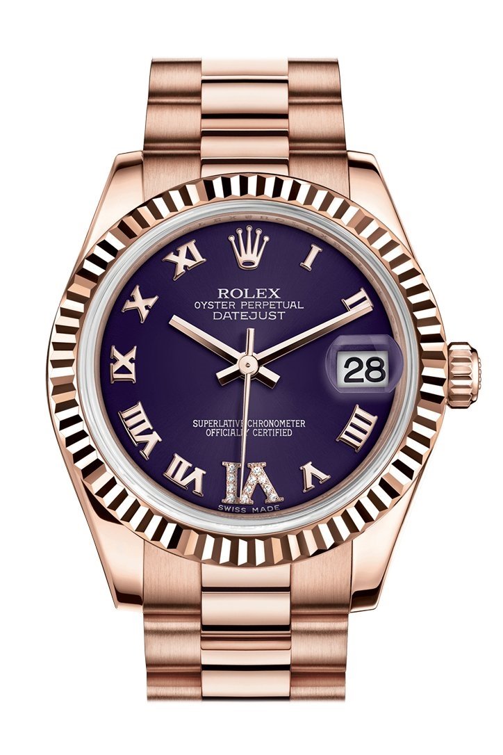 18k everose gold case with a 18k everose gold Rolex President bracelet. Fixed - fluted 18k everose gold bezel. Purple dial with rose-gold tone hands and Large VI Diamond Roman numeral hour markers. Dial Type: Analog. Date display at the 3 o'clock position. Automatic movement. 2235 engine. Scratch resistant sapphire crystal. Screw down crown. Solid case back. Case diameter: 31 mm. Round case shape. Concealed Crown clasp. Water resistant at 100 meters / 330 feet. Functions: date, hour, minute, second. Luxury watch style. Watch label: Swiss Made. Rolex Lady-Datejust 31 Purple Dial 18K Everose Gold President Automatic Ladies Watch 178275