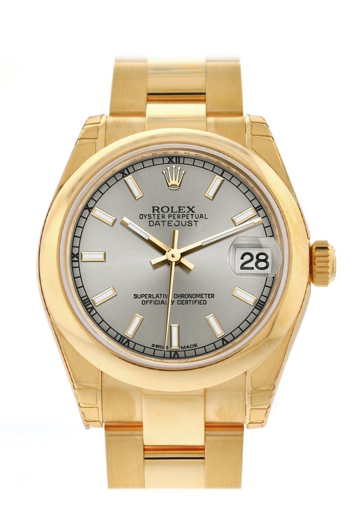 18k gold domed bezel. Silver dial with silver hands and Index numeral hour markers. Minute markers around the outer rim. Dial Type: analog. Date display at the 3 o'clock position. Automatic movement. Deployment clasp. Luxury watch style. Rolex Datejust Champagne Dial Automatic 18K Gold Bezel Watch 178248
