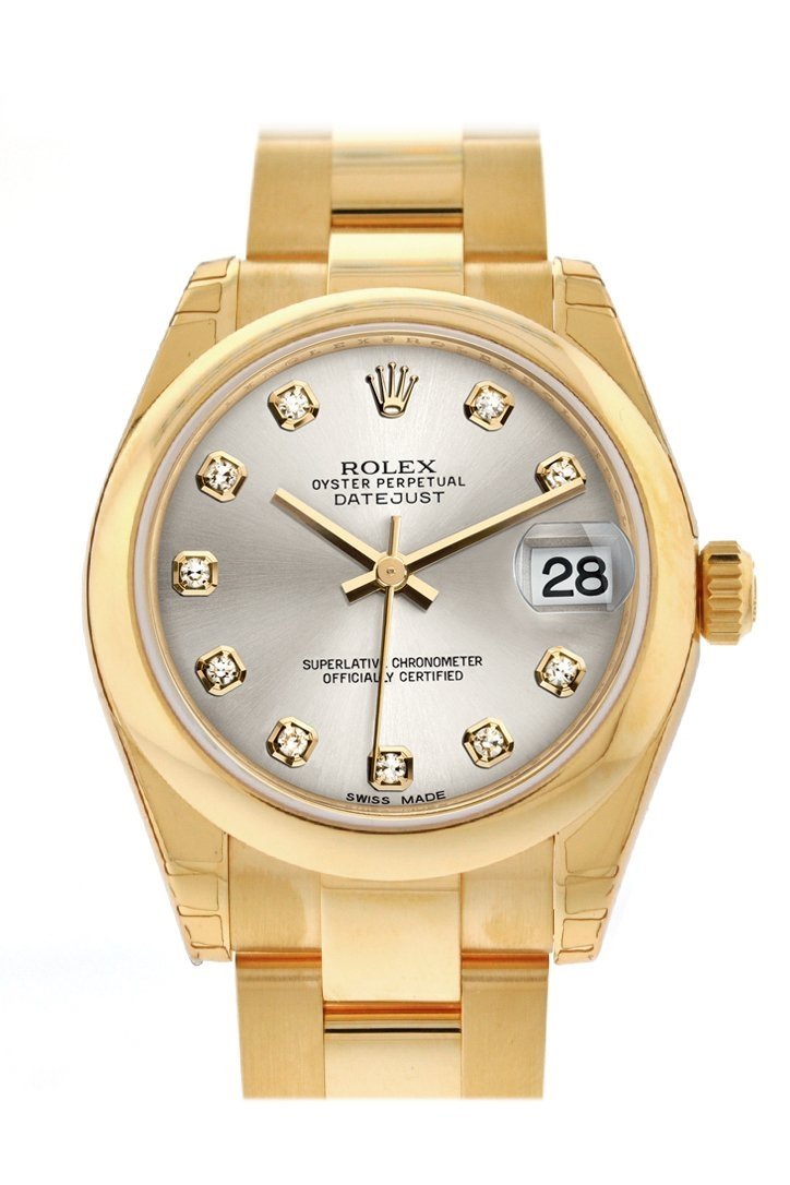 18k gold domed bezel. Silver Jubilee dial with Steel hands and Diamond numeral hour markers. Minute markers around the outer rim. Dial Type: analog. Date display at the 3 o'clock position. Automatic movement. Deployment clasp. Luxury watch style. Rolex Datejust Silver Jubilee Dial Automatic 18K Gold Bezel Watch 178248