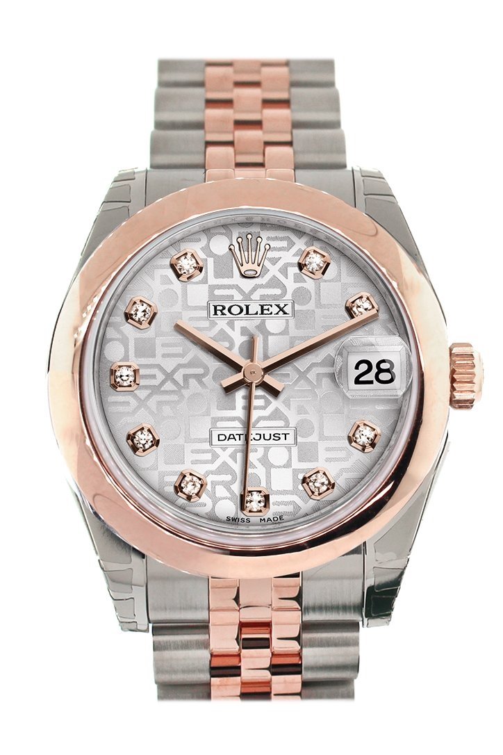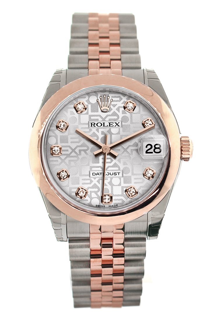 Everose gold case with a Jubilee everose gold bracelet. Domed bezel. Silver Jubilee dial with rose gold-tone hands and Diamond hour markers. Dial Type: Analog. Date display at the 3 o'clock position. Automatic movement. 2235 engine. Scratch resistant sapphire crystal. Screw down crown. Solid case back. Case diameter: 31 mm. Round case shape. Folding oysterclasp clasp. Water resistant at 100 meters / 330 feet. Functions: date, hour, minute, second. Luxury watch style. Watch label: Swiss Made.