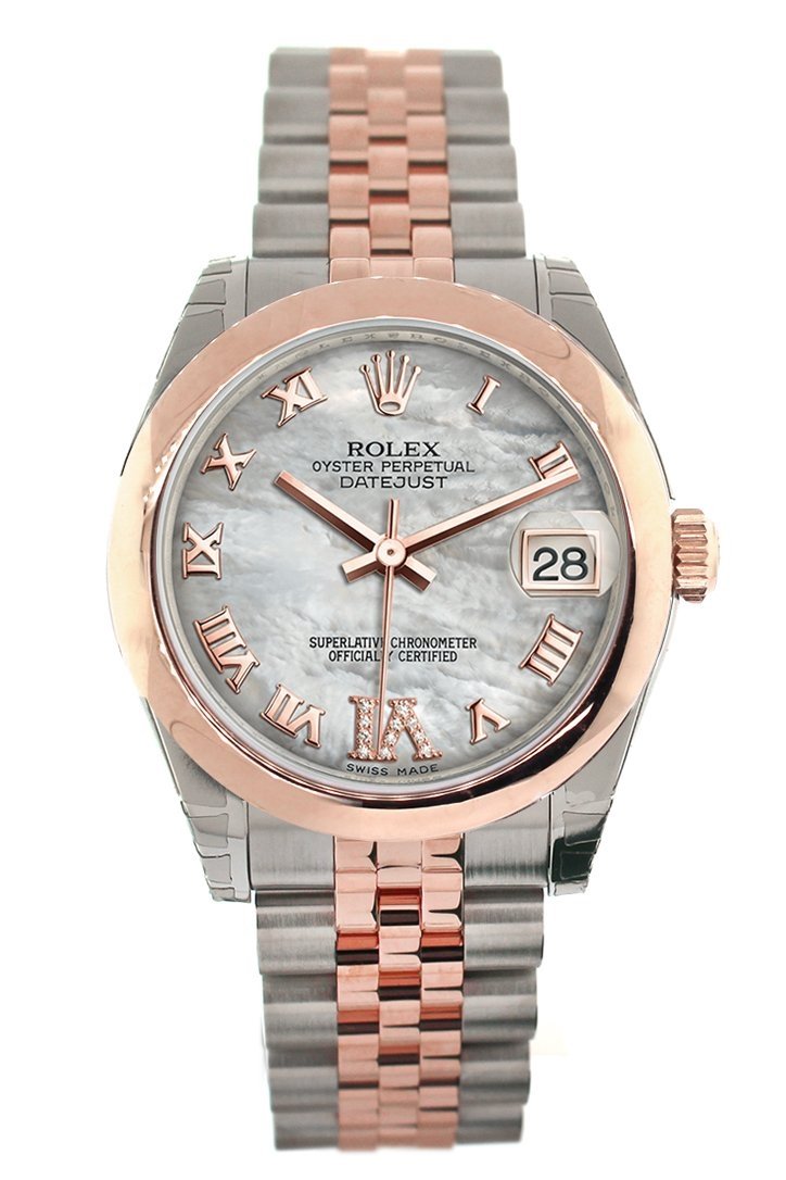 Everose gold case with a Jubilee everose gold bracelet. Domed bezel. Mother of Pearl dial with rose gold-tone hands and Roman Large VI set with Diamondhour markers. Dial Type: Analog. Date display at the 3 o'clock position. Automatic movement. 2235 engine. Scratch resistant sapphire crystal. Screw down crown. Solid case back. Case diameter: 31 mm. Round case shape. Folding oysterclasp clasp. Water resistant at 100 meters / 330 feet. Functions: date, hour, minute, second. Luxury watch style. Watch label: Swiss Made.