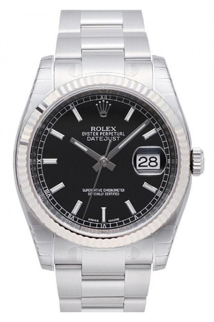 Stainless steel case with a stainless steel rolex oyster bracelet. Fixed - fluted 18k white gold bezel. Black dial with silver-tone hands and index hour markers. Minute markers. Dial Type: Analog. Luminescent hands and markers. Date display at the 3 o'clock position. Automatic movement. Scratch resistant sapphire crystal. Case diameter: 36 mm. Round case shape. Deployment clasp. Water resistant at 100 meters / 330 feet. Functions: date, hour, minute, second. Luxury watch style. Watch label: Swiss Made. rolex Oyster Perpetual 36 mm Black Dial Stainless Steel Rolex Oyster Automatic Mens Watch 116234
