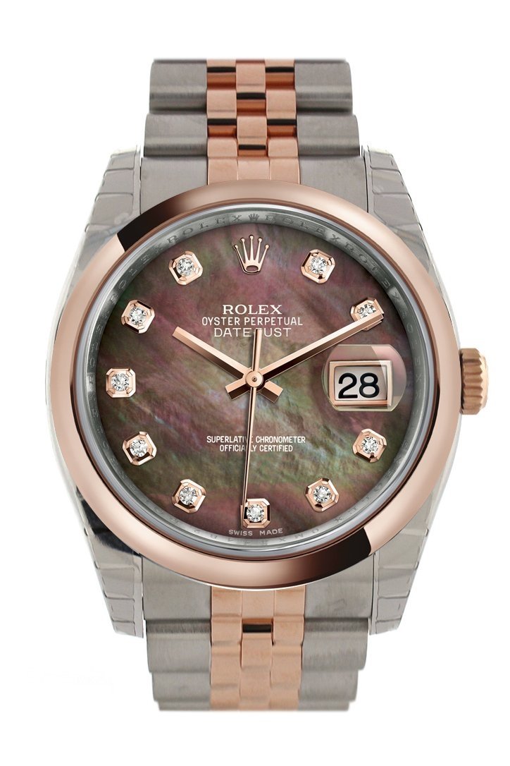 Stainless steel case with a stainless steel Rolex Jubilee bracelet with 18kt everose gold center links. Fixed Dome 18kt everose gold bezel. Black mother-of-pearl Jubilee dial with rose gold-tone hands and diamonds numeral hour markers. Minute markers around the outer rim. Dial Type: Analog. Date display at the 3 o'clock position. Rolex calibre 3135 automatic movement with a 50-hour power reserve. Scratch resistant sapphire crystal. Screw down crown. Solid case back. Case size: 36 mm. Round case shape. Oysterlock clasp. Water resistant at 100 meters / 330 feet. Functions: date, hour, minute, second. Luxury watch style. Watch label: Swiss Made. Rolex Oyster Perpetual Datejust 36 Black mother-of-pearl Dial Stainless White and 18K Everose Gold Rolex Jubilee Automatic Men's Watch 116201