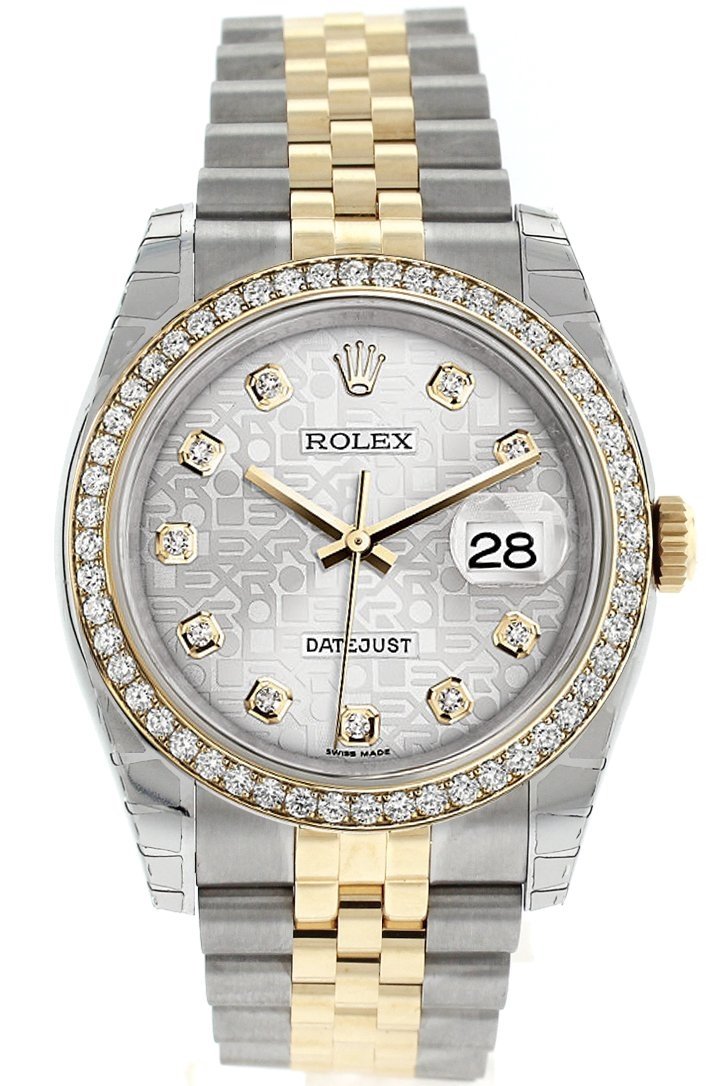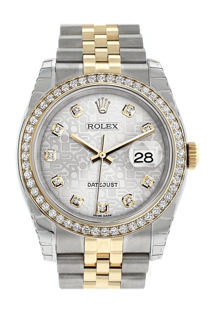 Stainless steel case with a stainless steel jubilee bracelet. Diamond bezel. Silver Jubilee dial with silver-tone hands and diamond hour markers. Dial Type: Analog. Date display at the 3 o'clock position. Automatic movement. Scratch resistant sapphire crystal. Screw down crown. Case diameter: 36 mm. Concealed crown clasp. Water resistant at 100 meters / 330 feet. Functions: hours, minutes, seconds, date. Luxury watch style. Watch label: Swiss Made. Rolex Datejust Silver Jubilee Dial Diamond Bezel Automatic Steel Ladies Watch. 116243