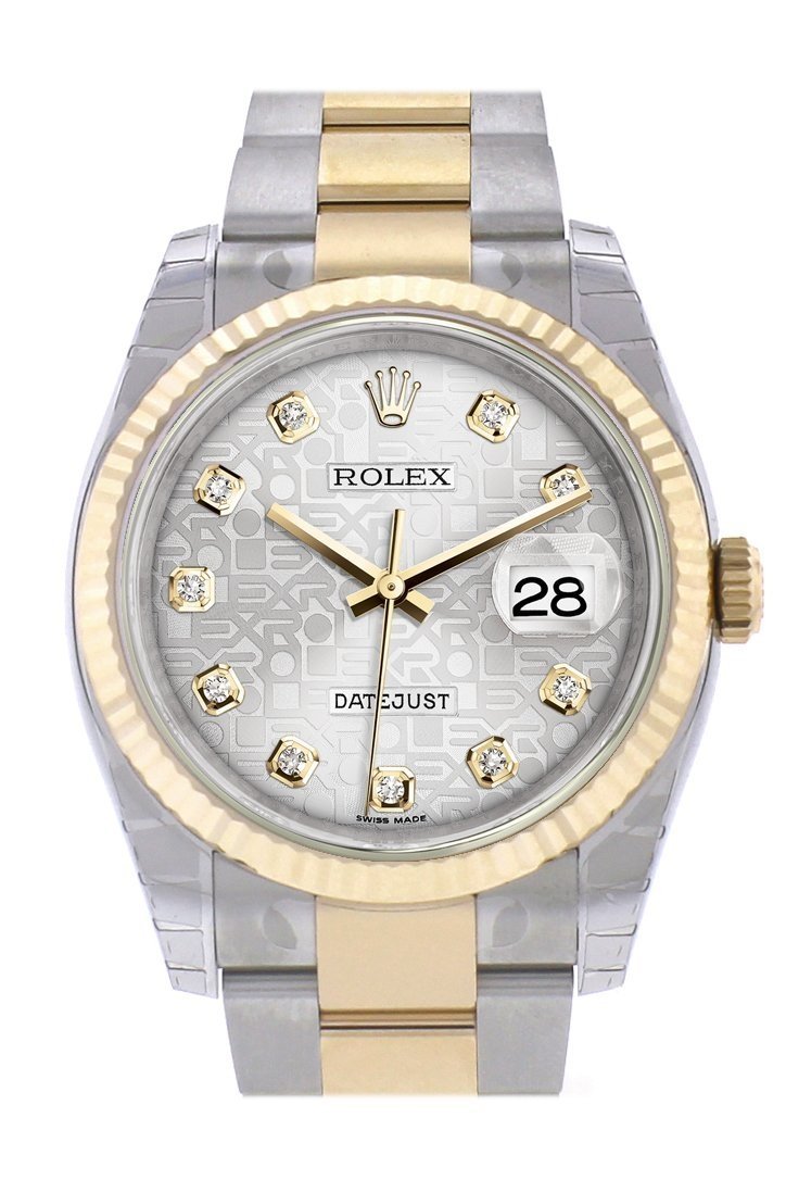 Stainless steel case with a stainless steel Rolex oyster bracelet with 18kt yellow gold center links. Fixed fluted18kt yellow gold bezel. Silver Jubilee dial with yellow gold hands and Diamond numeral hour markers. Dial Type: Analog. Date display at the 3 o'clock position. Rolex calibre 3135 automatic movement with a 50-hour power reserve. Scratch resistant sapphire crystal. Screw down crown. Solid case back. Case size: 36 mm. Round case shape. Oysterlock clasp. Water resistant at 100 meters / 330 feet. Functions: date, hour, minute, second. Luxury watch style. Watch label: Swiss Made. Rolex Datejust 36 Silver Jubilee Diamond Dial Stainless Steel and 18K Yellow Gold Rolex Oyster Automatic Mens Watch 116233