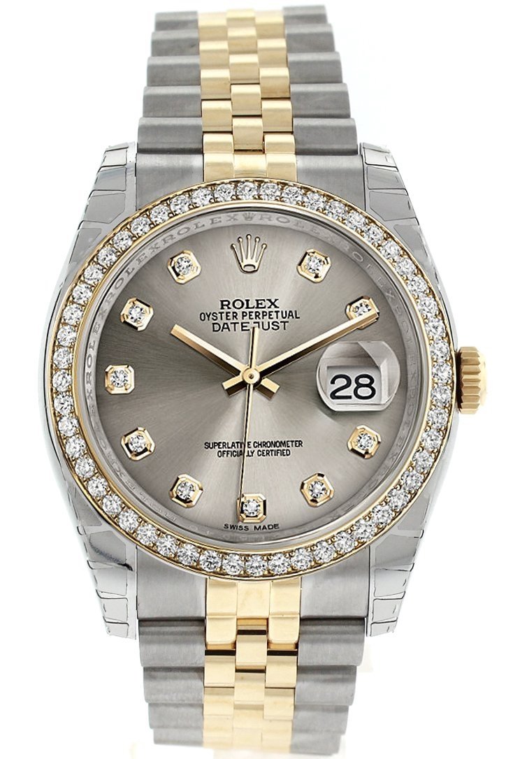Stainless steel case with a stainless steel jubilee bracelet. Diamond bezel. Steel dial with silver-tone hands and diamond hour markers. Dial Type: Analog. Date display at the 3 o'clock position. Automatic movement. Scratch resistant sapphire crystal. Screw down crown. Case diameter: 36 mm. Concealed crown clasp. Water resistant at 100 meters / 330 feet. Functions: hours, minutes, seconds, date. Luxury watch style. Watch label: Swiss Made. Rolex Datejust Steel Dial Diamond Bezel Automatic Steel Ladies Watch. 116243