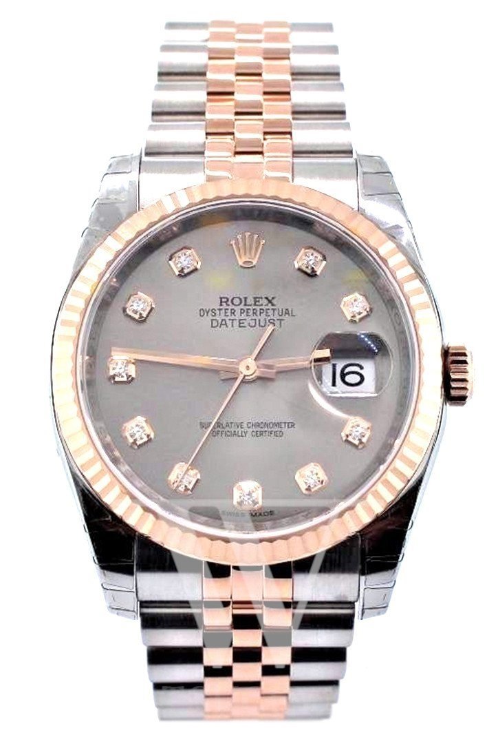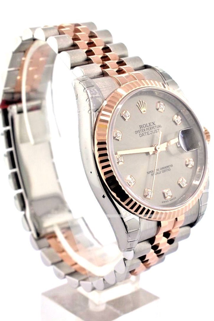 Fluted 18kt rose gold bezel. Steel dial with gold tone hands and Diamond hour markers. Minute markers around the outer rim. Dial Type: Analog. Date displays at the 3 o'clock position. Self-winding movement. Scratch resistant sapphire crystal. Case diameter: 36 mm. Round case shape. Deployment clasp. Water resistant at 100 meters/ 330 feet. Functions: hours, minutes, seconds, date. Luxury watch style. Watch label: Swiss Made. Rolex Datejust Steel Dial Fluted 18k Rose Gold Bezel Jubilee Bracelet Mens Watch 116231