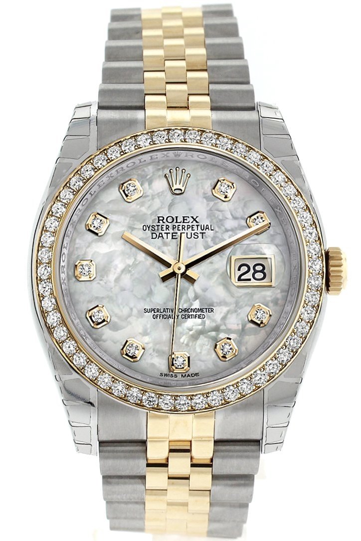 Stainless steel case with a stainless steel jubilee bracelet. Diamond bezel. Mother of Pearl dial with silver-tone hands and diamond hour markers. Dial Type: Analog. Date display at the 3 o'clock position. Automatic movement. Scratch resistant sapphire crystal. Screw down crown. Case diameter: 36 mm. Concealed crown clasp. Water resistant at 100 meters / 330 feet. Functions: hours, minutes, seconds, date. Luxury watch style. Watch label: Swiss Made. Rolex Datejust Mother of Pearl Dial Diamond Bezel Automatic Steel Ladies Watch. 116243