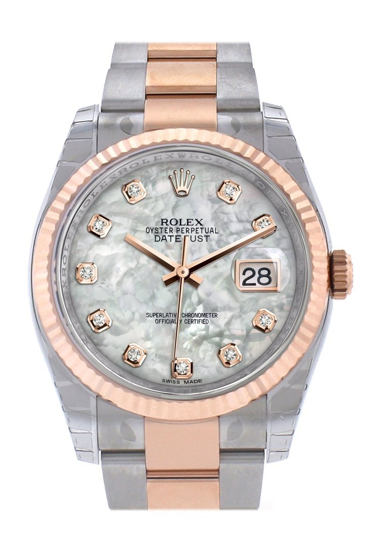 18kt pink gold and stainless steel case with a 18kt pink gold and stainless steel bracelet. Fluted bezel. White mother-of-pearl set with diamonds dial with rose-gold tone hands and diamonds hour markers. Dial Type: Analog. Date display at the 3 0'clock position. Automatic movement. Scratch resistant sapphire crystal. Screw down crown. Case diameter: 36 mm. Oysterclasp clasp. Water resistant at 100 meters / 330 feet. Functions: hours, minutes, seconds, date. Luxury watch style. Watch label: Swiss Made. Rolex Datejust White mother-of-pearl set with diamonds Dial Automatic Pink Gold and Stainless Steel Men's Watch 116231